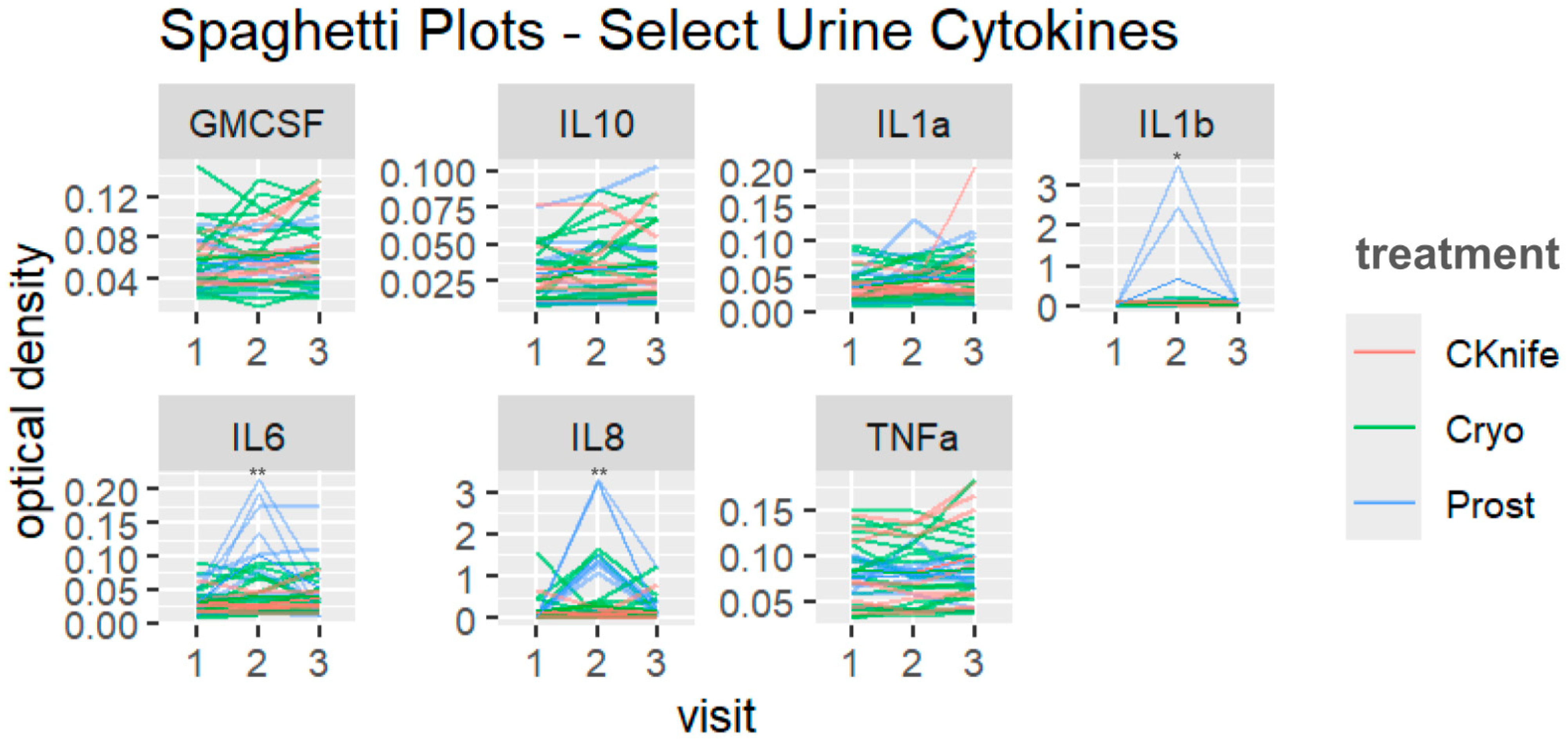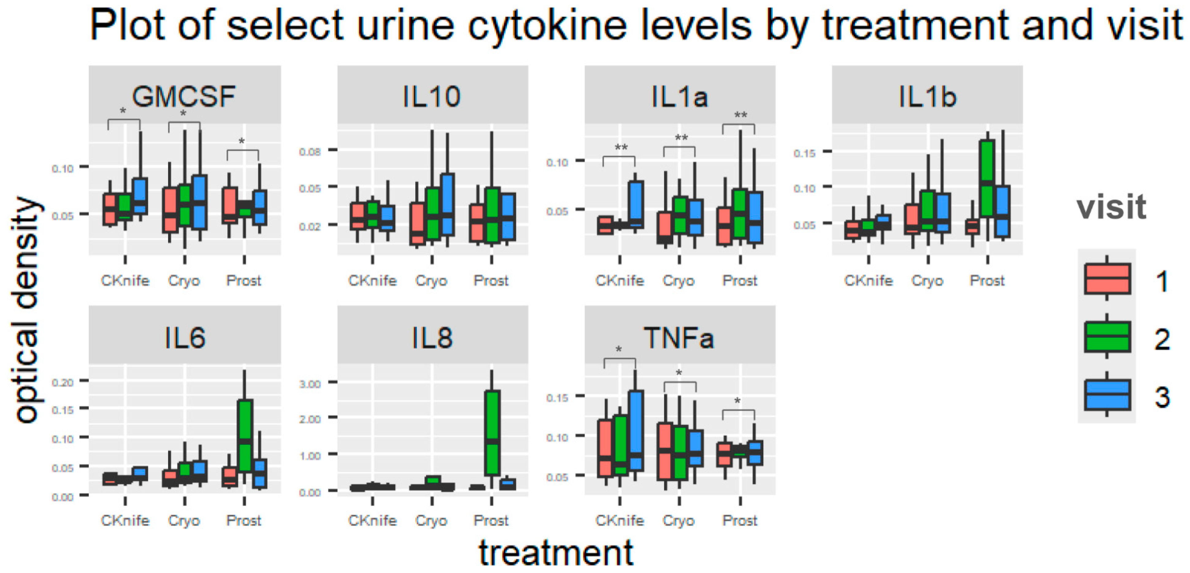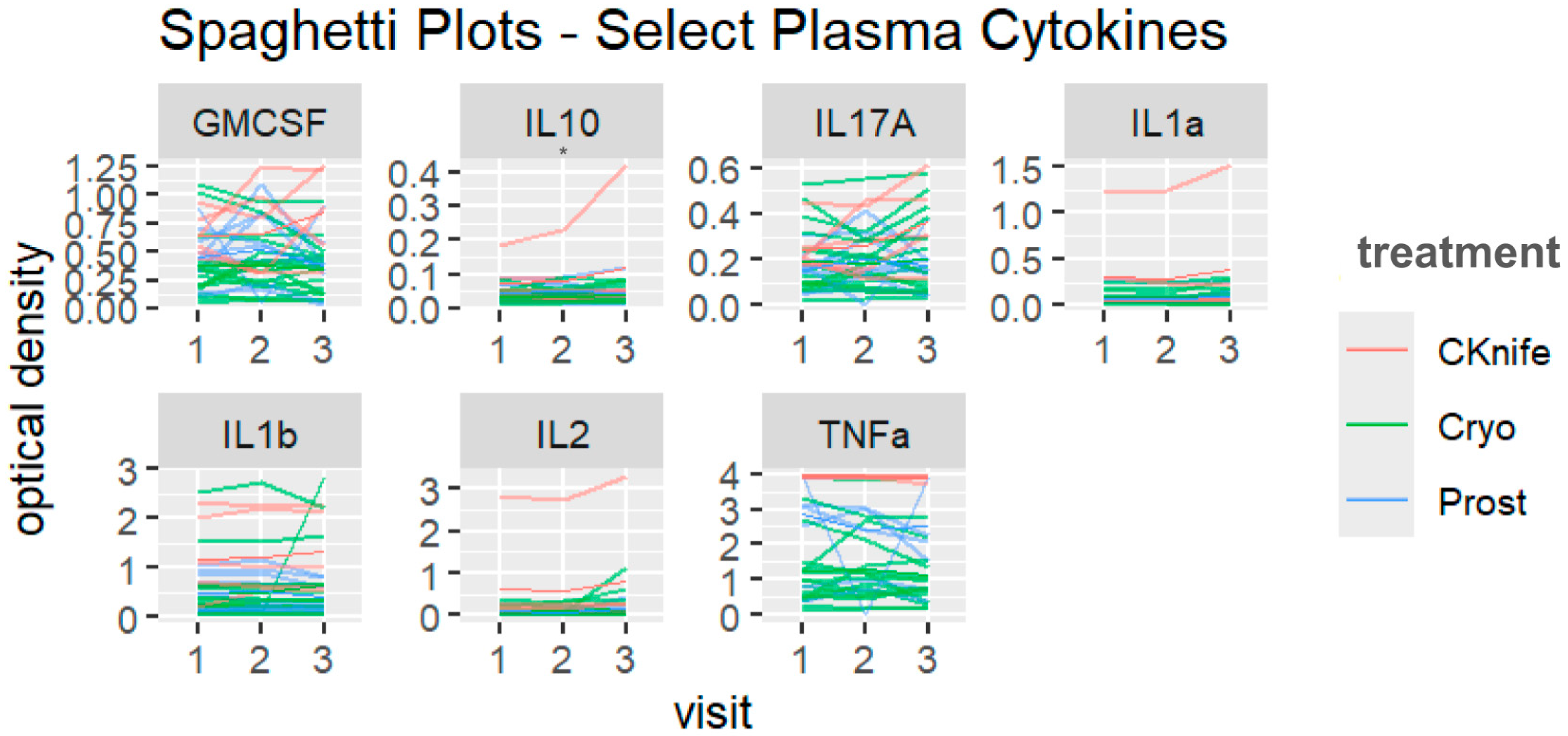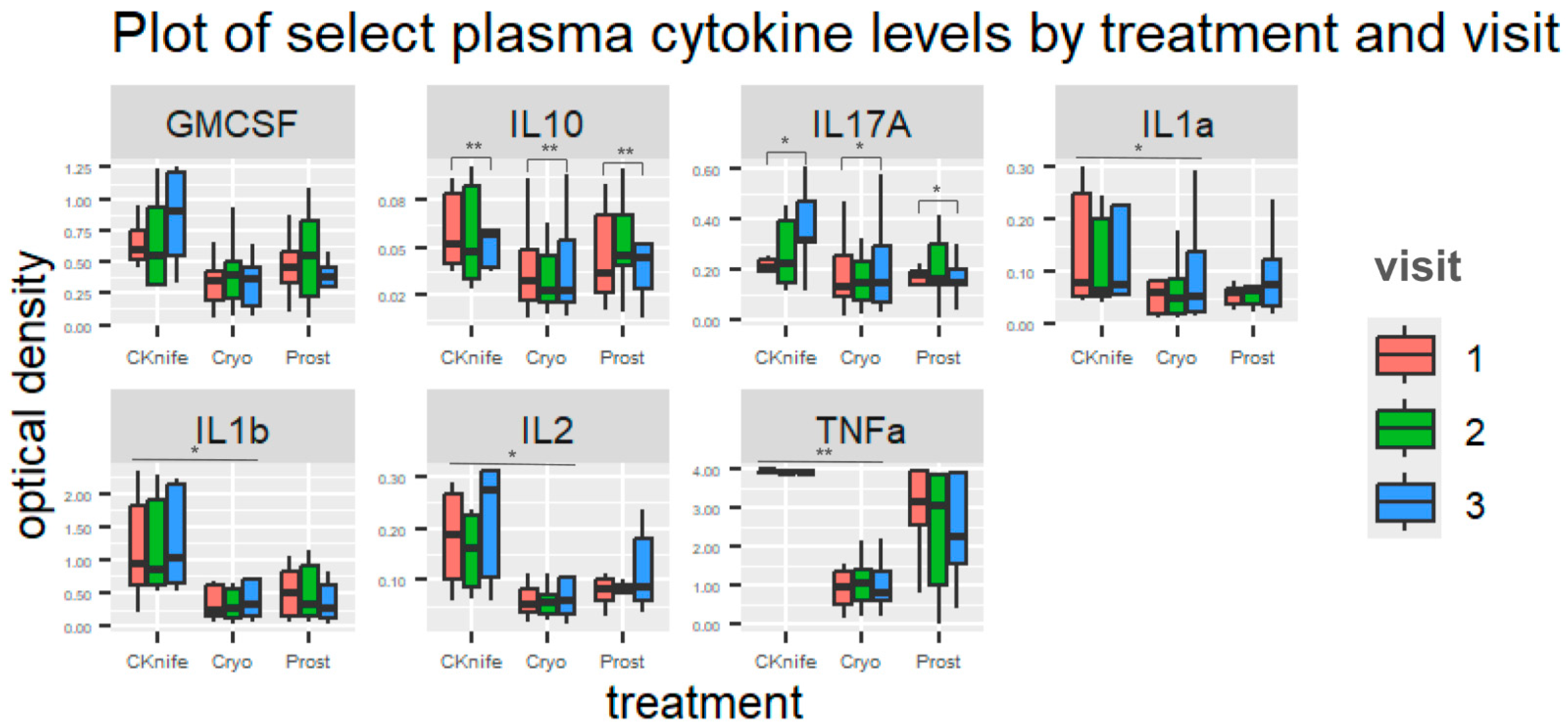 3.5. Cytokine Levels Associated with Treatment Type and Visit Number