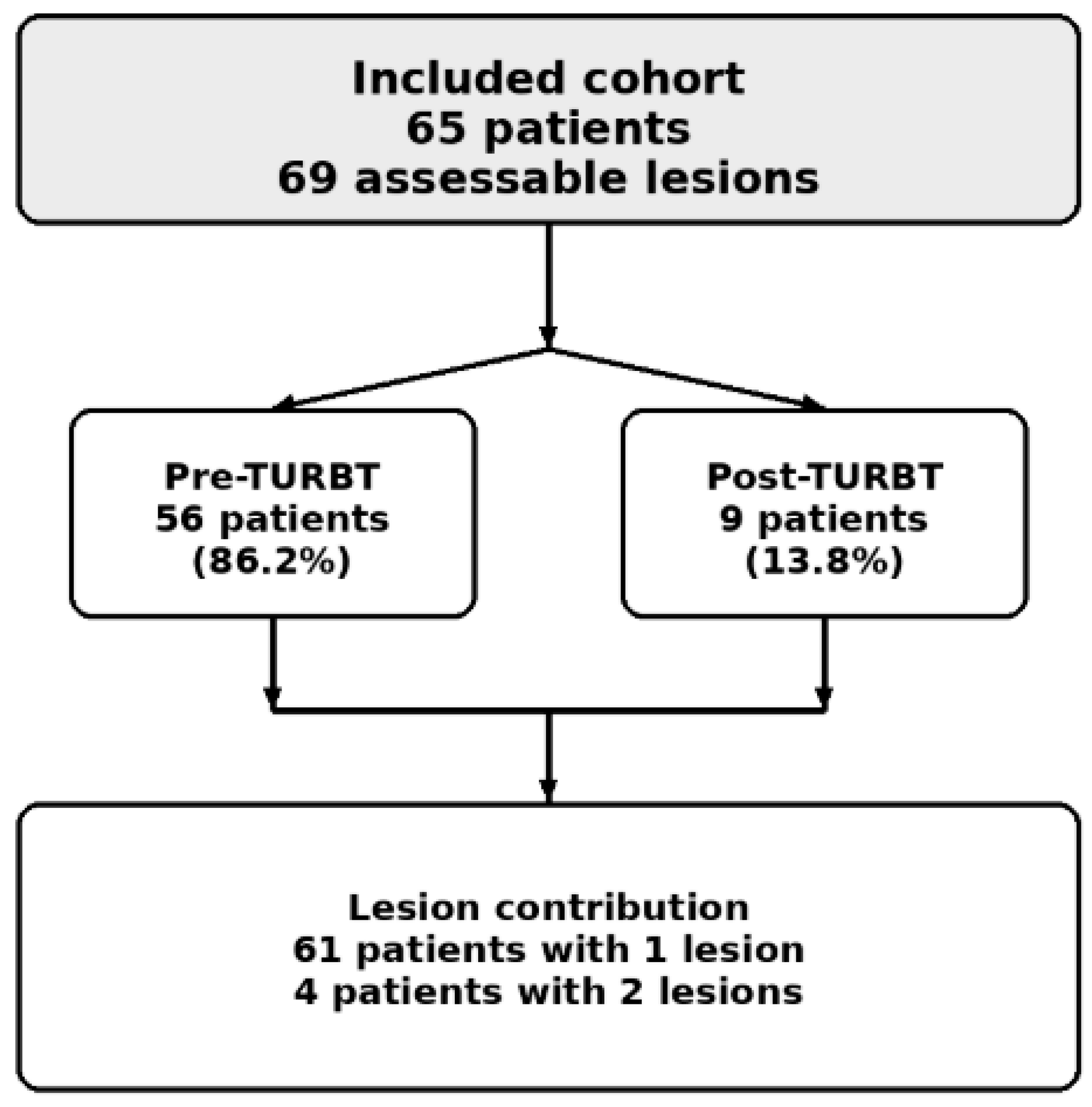 - Khwaja, S.A.; Caglic, I.; Shaida, N.; Colquhoun, A.J.; Turner, W.; Barrett, T. Evaluation of magnetic resonance imaging for bladder cancer detection following transurethral resection of bladder tumour (TURBT). Abdom. Radiol. 2024, 49, 2340–2348. [Google Scholar] [CrossRef]