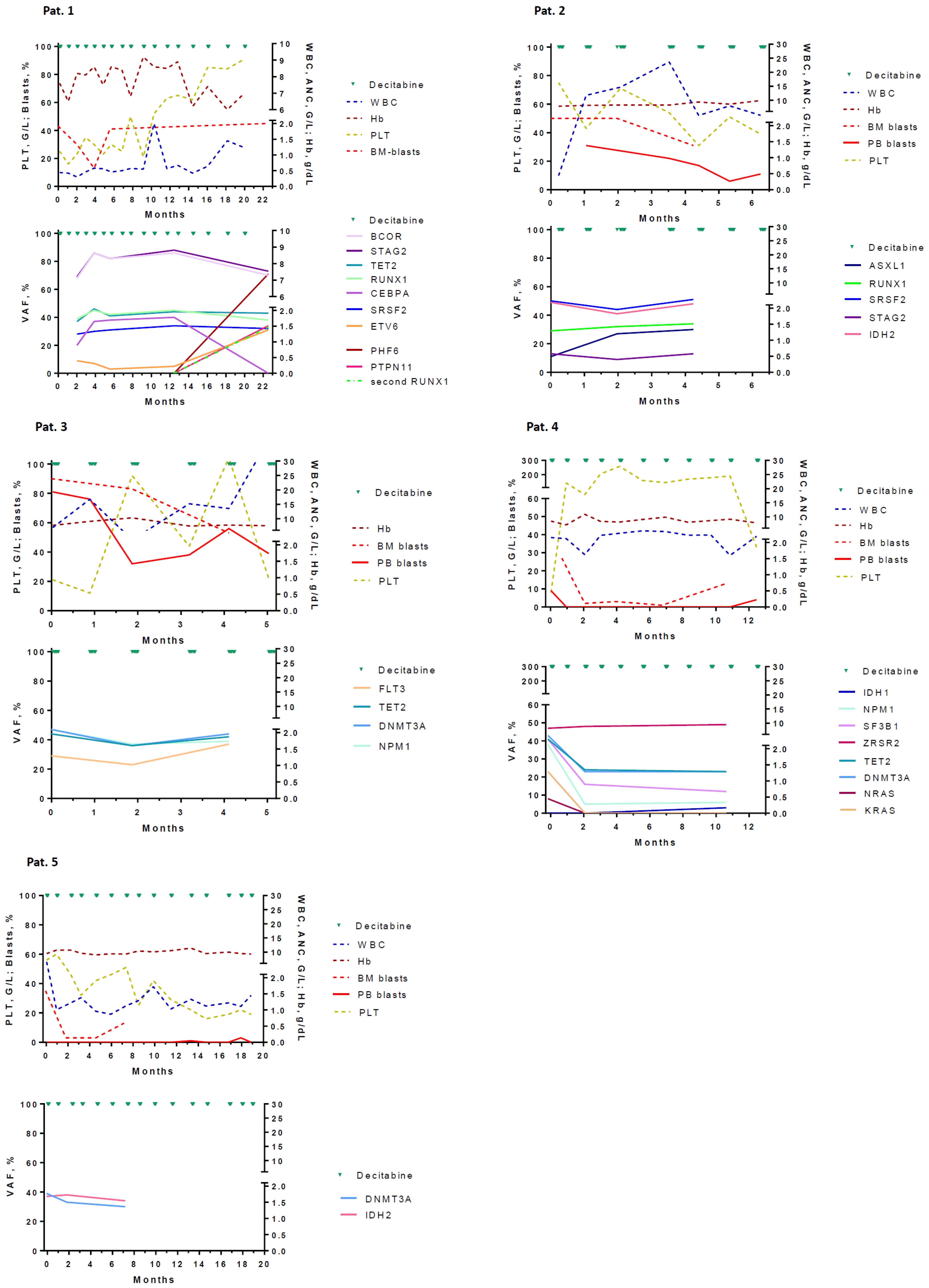 | 3 | female | 81 | AML with mutated NPM1 | Chronic renal failure | NA | NPM1 47%, DNMT3A 47% FLT3 29% TET2 44% |