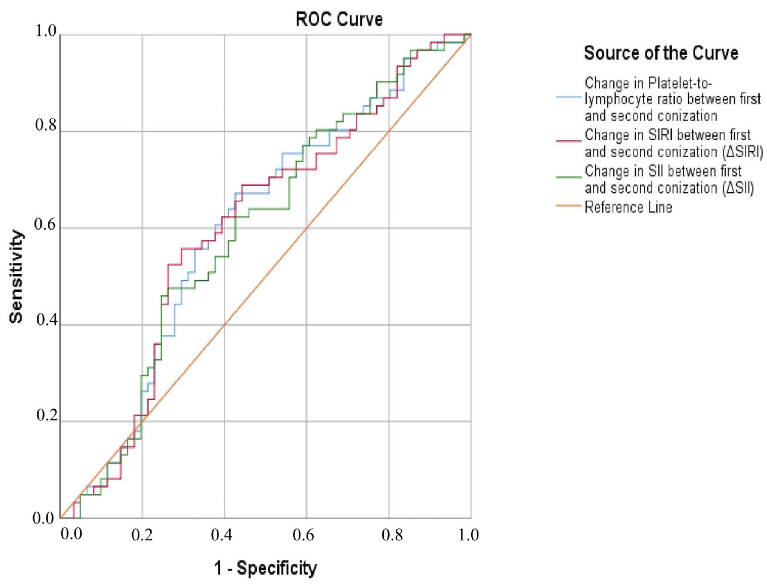 | Change in SIRI Between First and Second Surgery (ΔSIRI) | Change in SII Between First and Second Surgery (ΔSII) | Change in PLR Between First and Second Surgery (ΔPLR) | |