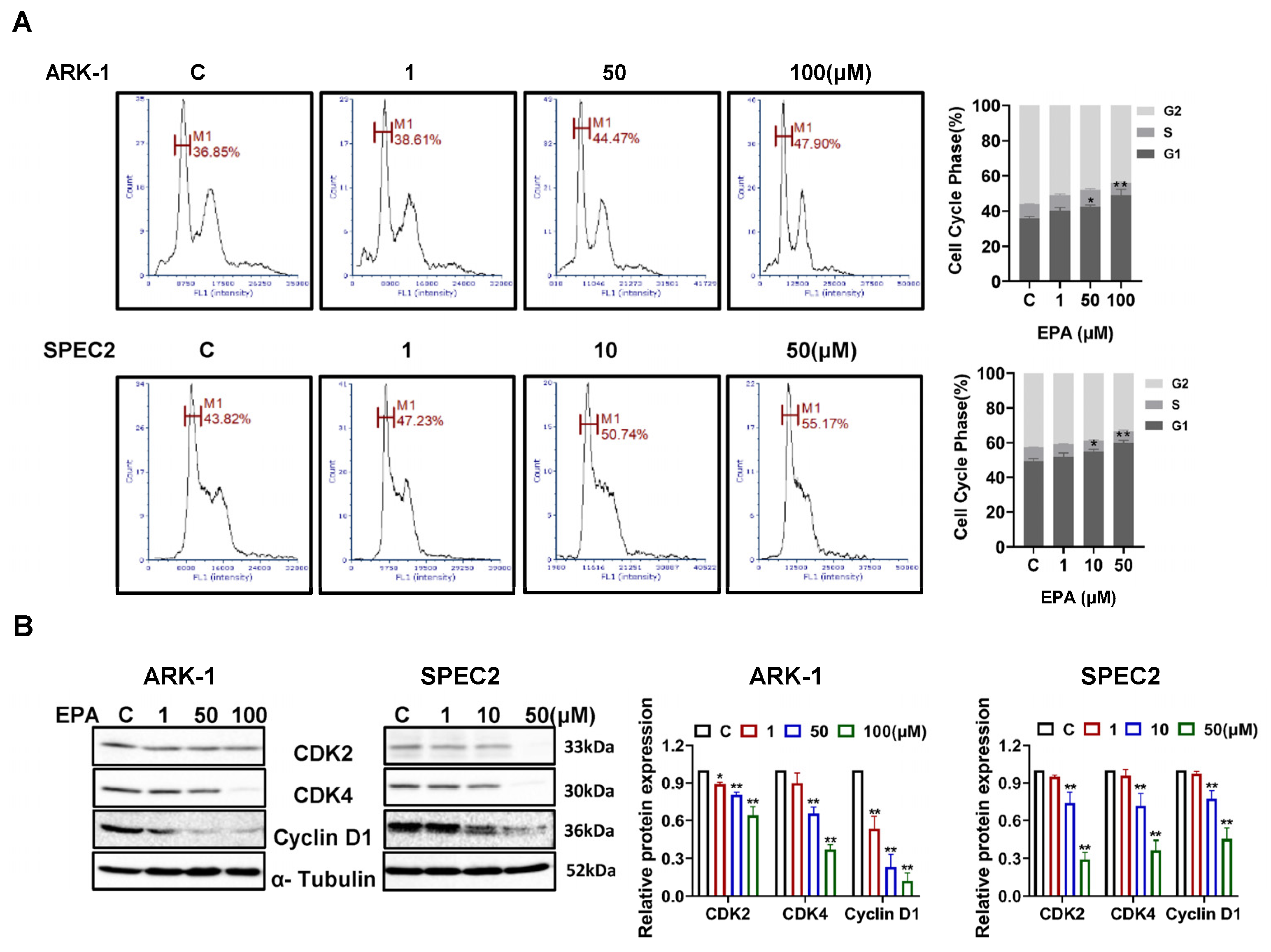 3.2. EPA Induces G1 Phase Cell Cycle Arrest in USC Cells