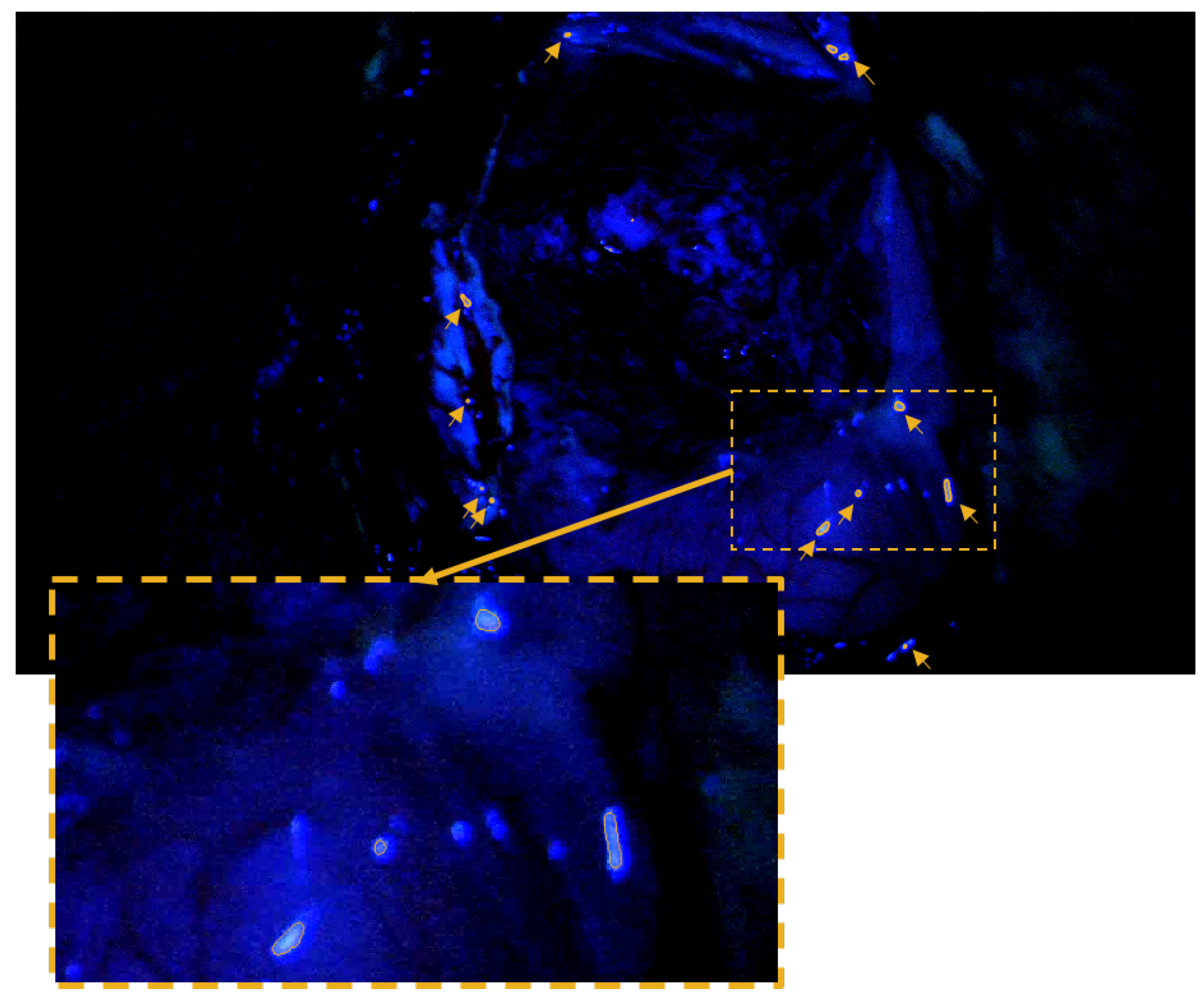 Further, the fluorescent regions identified by the clVAE extended well beyond the surgeon-annotated areas by visual assessment—often by a significant margin. Although pixel-wise ground truth was unavailable for the images used in this study, it is highly plausible that the areas detected by the clVAE are based on a learned fluorescence fingerprint. Beyond the experimental data, this is further supported by the expansion of the detected areas, which not only encompass the surgeon-annotated regions but also the fading fluorescence at their periphery, extending into well-illuminated tissue. Importantly, the detected areas differed markedly from false positives found in the images from non-fluorescence-guided procedures. The latter were typically small, scattered, and primarily associated with reflections on the tissue surface.