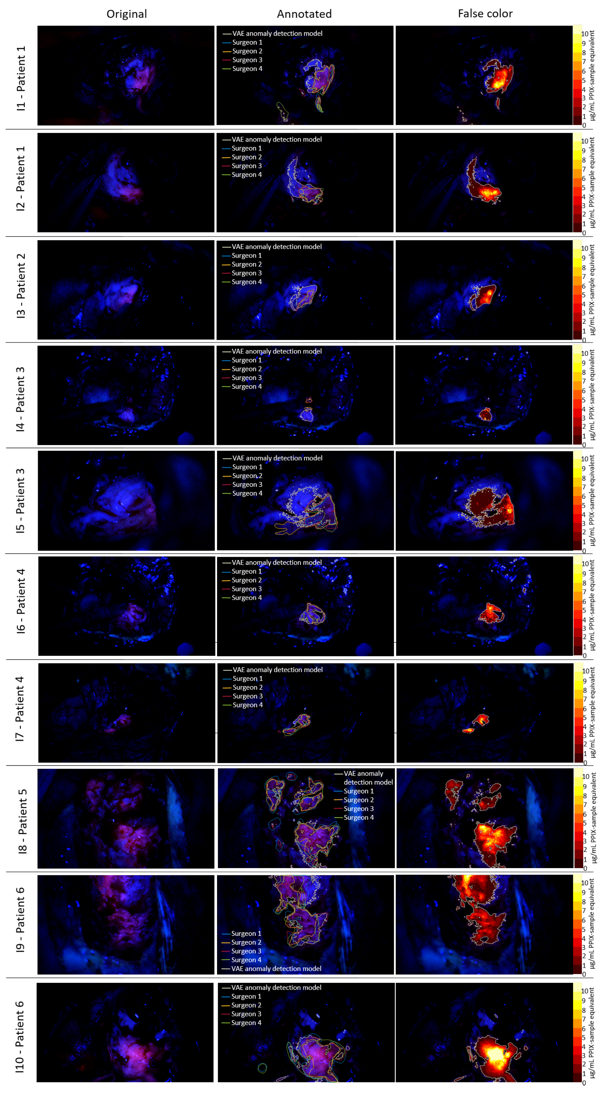 = 1 clVAE was selected for application to real intraoperative data. In this new training phase, 500,000 randomly selected pixels extracted from non-FGS surgery images were used as normal data, accompanied by 50,000 normal–anomaly pairs (see