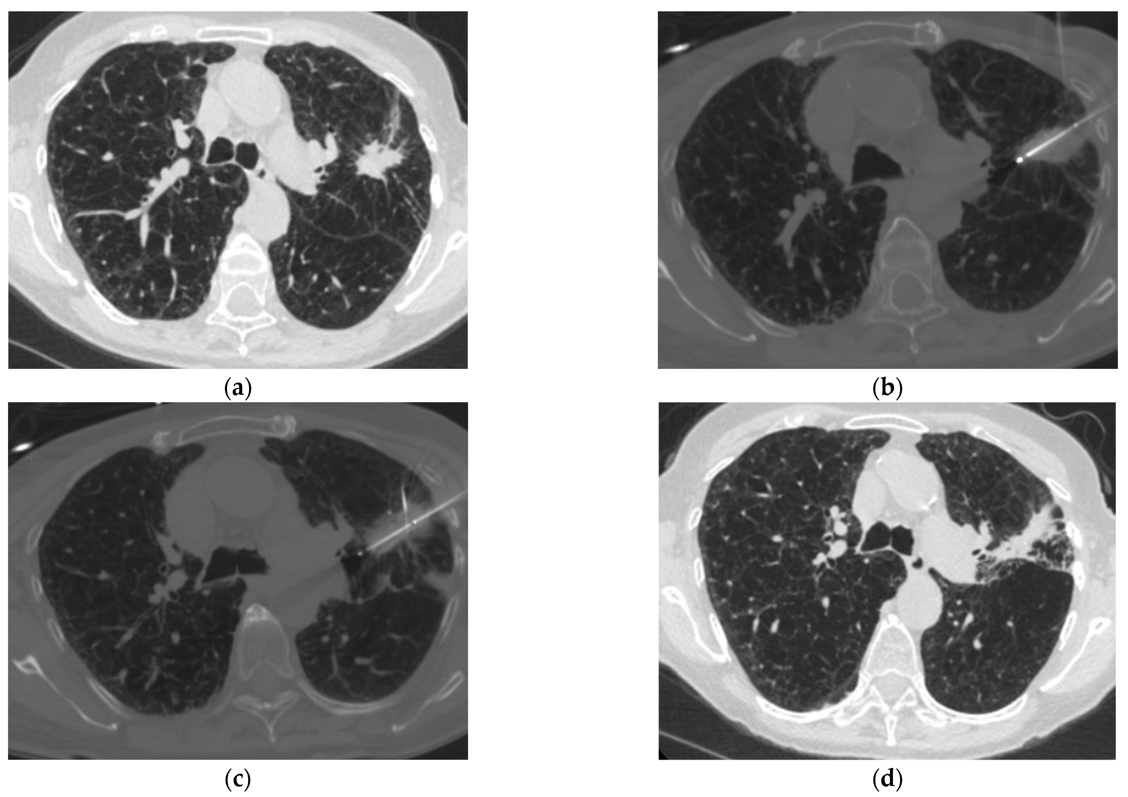 - Chang, L.-K.; Su, P.-K.; Malwade, S.; Chung, W.-Y.; Chan, P.-S.; Chen, S.-C.; Chen, L.-C.; Yang, S.-M. Enhancing Microwave Ablation for Lung Lesions with Cone-Beam Computed Tomography Guidance and Intrapulmonary Fine Adjustment in a Hybrid Operating Room. Acad. Radiol. 2025, 32, 7591–7600. [Google Scholar] [CrossRef]