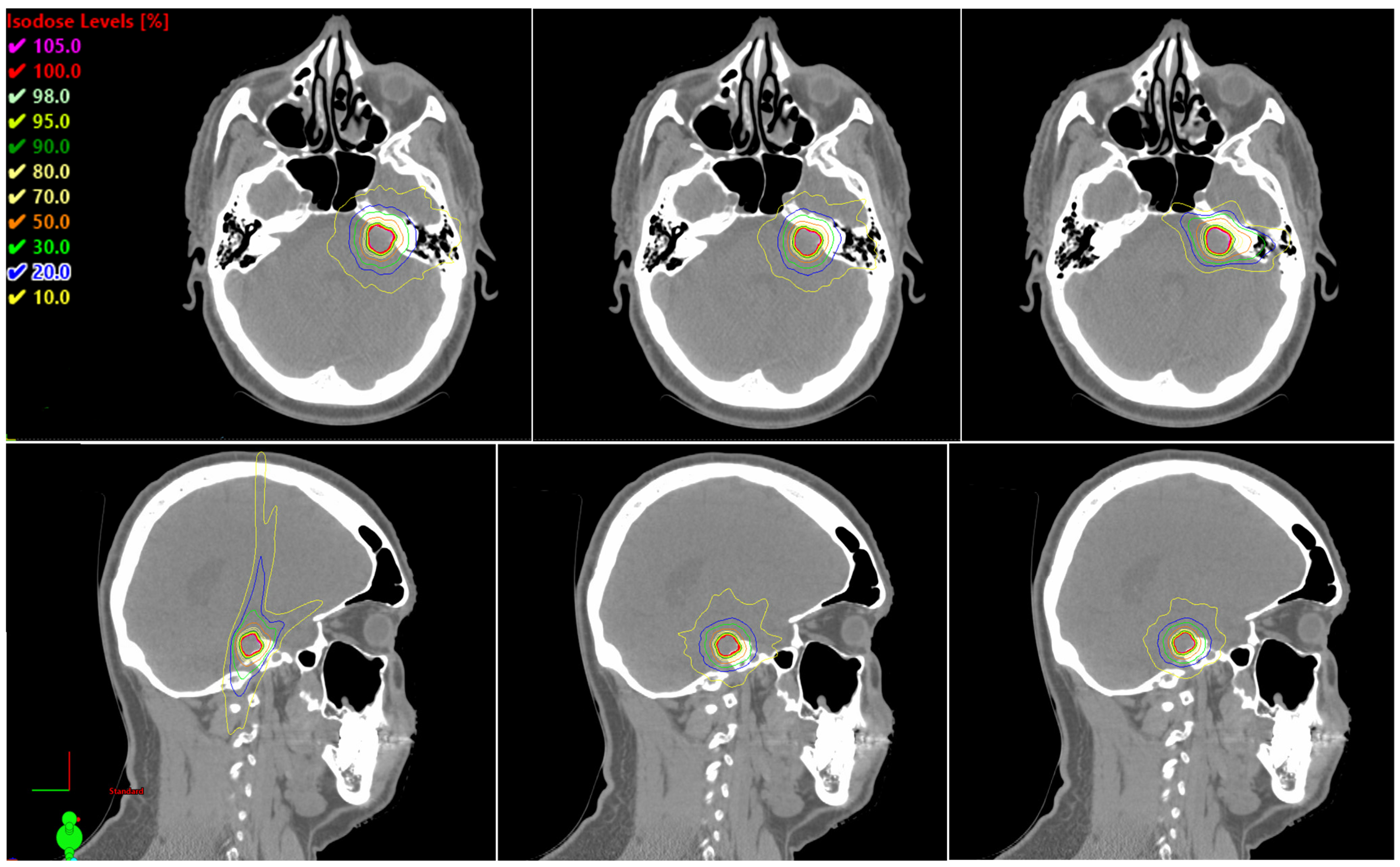 - Xiong, Z.; Cheng, C.; Zhou, L.; Eckroate, B.; Bell, L.; Warburton, F.; Huang, D.; Motwani, S.B.; Cathcart, C.S.; Nie, K.; et al. Dosimetric evaluation of a novel automated noncoplanar volumetric modulated arc therapy technique for treating optic nerve sheath meningiomas. Front. Oncol. 2025, 15, 1531918. [Google Scholar] [CrossRef]