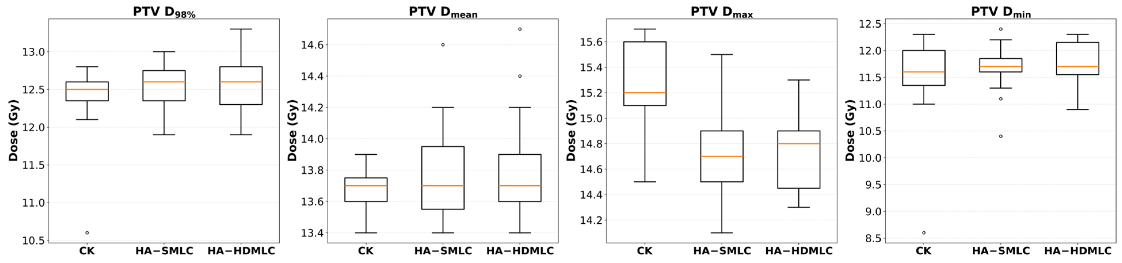 2.5. Dosimetric Parameters and Plan Quality Analysis