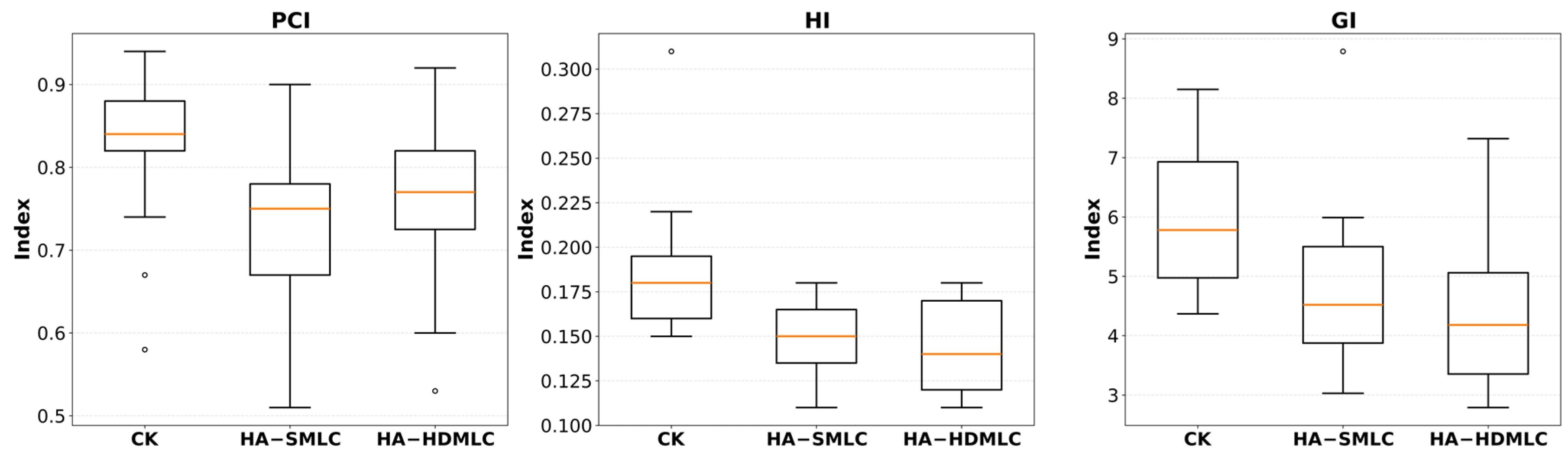 | CK (a) | HA-SMLC (b) | HA-HDMLC (c) | a vs. b | a vs. c | b vs. c | |||||