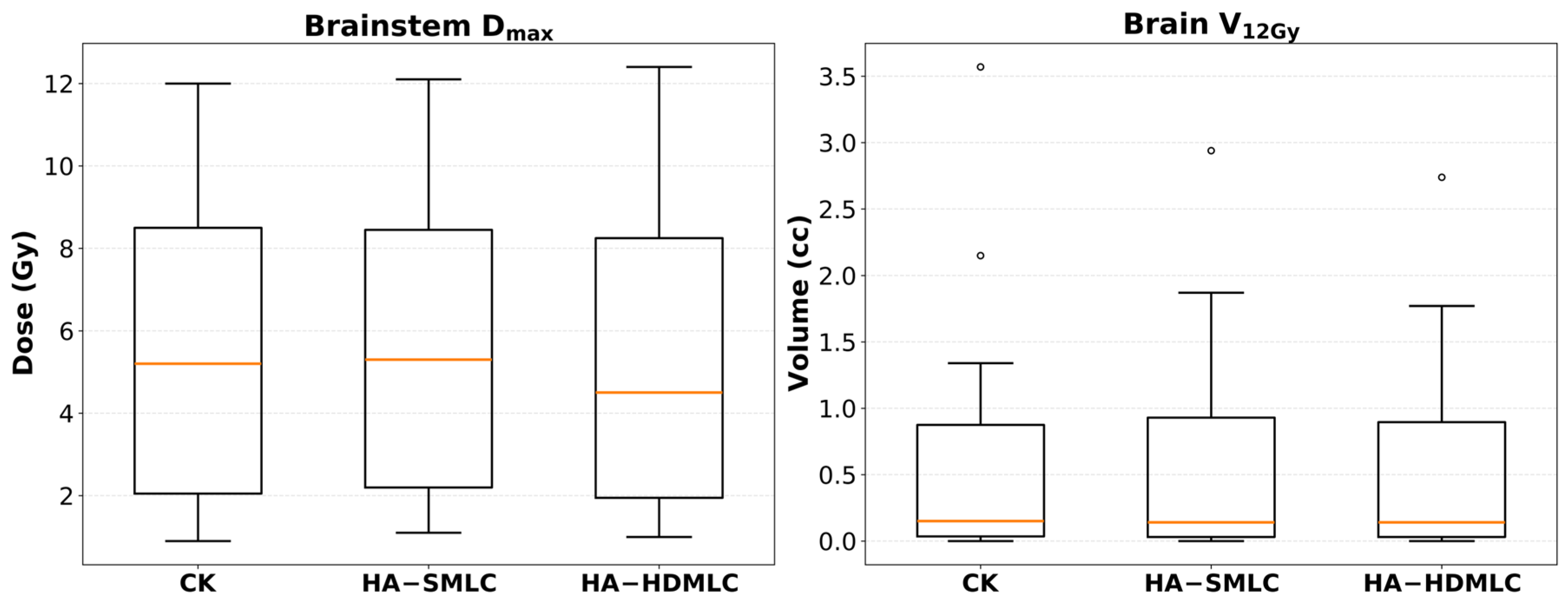 - Guinement, L.; Salleron, J.; Buchheit, I.; Gérard, K.; Faivre, J.C.; Royer, P.; Marchesi, V. Comparison between the HyperArc™ technique and the CyberKnife® technique for stereotactic treatment of brain metastases. Cancer Radiother. 2023, 27, 136–144. [Google Scholar] [CrossRef]