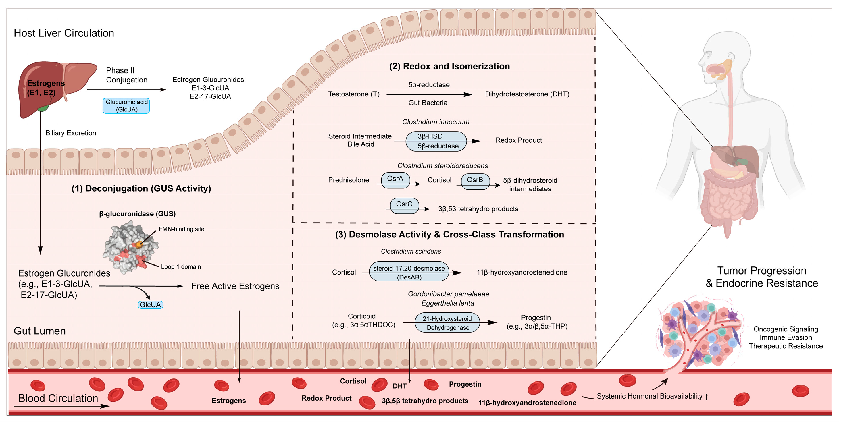 Cross-class transformation via carbon-chain cleavage: The gut microbiota not only modifies individual hormones but also mediates the inter-conversion between different hormonal classes. Biochemical characterizations reveal that commensal species, such as C. scindens, express a steroid-17,20-desmolase (DesAB) [23]. This enzyme directly cleaves the side chains of glucocorticoids, including cortisol and prednisolone, converting them into 11-oxy-androgens such as 1,4-androstadiene-3,11,17-trione [23,24]. Simultaneously, taxa like Gordonibacter pamelaeae and Eggerthella lenta utilize 21-dehydroxylases to shunt glucocorticoids into progestins [25,26]. Collectively, these microbe-driven structural modifications and cross-class conversions transform the gut into a metabolic reactor. As illustrated in Figure 1, the resulting active steroids are reabsorbed into the blood circulation, significantly increasing systemic hormonal bioavailability. This systemic influx subsequently infiltrates the tumor microenvironment (TME), providing the essential fuel to drive oncogenic signaling, immune evasion, and adaptive endocrine resistance.