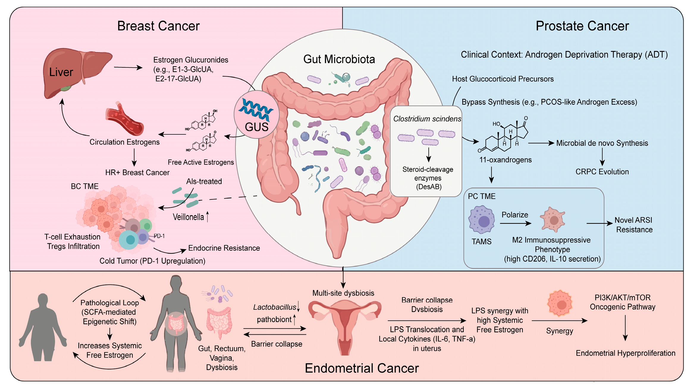 Figure 2. A comprehensive landscape of the mechanisms by which the gut microbiota reshapes the evolution and microenvironment of hormone-dependent malignancies. Breast Cancer: Intestinal GUS enzymes enhance systemic free estrogen levels via EHC, thereby driving the proliferation of HR+ tumors and inducing an immunosuppressive TME, characterized by T cell exhaustion, Treg infiltration and a cold tumor phenotype (PD-1 upregulation). Furthermore, the enrichment of Veillonella induced by aromatase inhibitor (AI) therapy promotes acquired endocrine resistance. Prostate Cancer: Specific gut taxa, such as Clostridium scindens, utilize DesAB enzymes for the bypass synthesis of 11-oxy-androgens (mimicking PCOS-like androgen excess), which exacerbates CRPC and induces the polarization of TAMs toward the M2 phenotype, ultimately leading to ARSI resistance. Endometrial Cancer: Obesity-driven SCFA depletion triggers a pathological loop (SCFA-mediated epigenetic shift), which synergizes with coordinated dysbiosis across anatomical sites and LPS translocation to activate the PI3K/AKT/mTOR pathway and facilitate abnormal endometrial proliferation. (GUS, β-glucuronidase; HR+, hormone receptor-positive; TME, tumor microenvironment; Tregs, regulatory T cells; ADT, androgen deprivation therapy; CRPC, castration-resistant prostate cancer; TAMs, tumor-associated macrophages; ARSI, androgen receptor signaling inhibitors; LPS, lipopolysaccharides; SCFA, short-chain fatty acids.).
