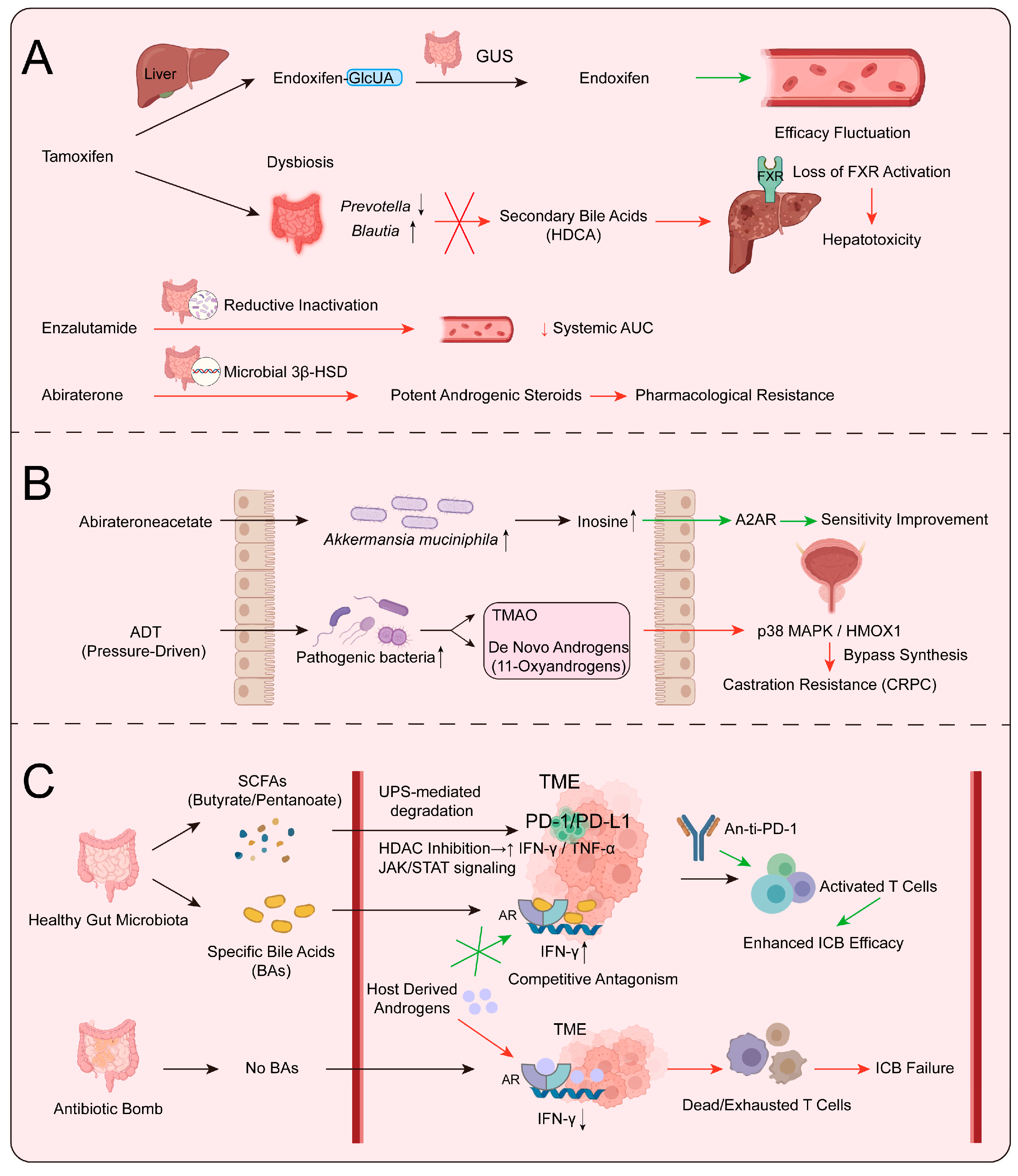Figure 3. Biochemical and molecular mechanisms of the microbiota–endocrine–immune axis in modulating therapeutic efficacy. (A) Pharmacokinetics and Toxicity: The gut acts as a metabolic reactor where microbial GUS enzymes and reductive pathways (for enzalutamide) modulate systemic exposure. Microbial 3β-HSD transforms Abiraterone into potent androgens, driving pharmacological resistance. Drug-induced dysbiosis (e.g., Prevotella) disrupts the HDCA–FXR axis, leading to hepatotoxicity. (B) Adaptive Resistance: Chronic therapeutic pressure enriches Akkermansia, promoting the production of Inosine which enhances sensitivity via the A2AR receptor. Conversely, pathogenic enrichment facilitates 11-Oxyandrogen bypass synthesis and TMAO production, driving p38 MAPK/HMOX1 signaling and CRPC progression. (C) ICI Immunotherapy: Healthy microbiota-derived metabolites optimize the TME. SCFAs (Butyrate/Pentanoate) regulate PD-1/PD-L1 stability via UPS-mediated degradation, JAK/STAT signaling, and HDAC inhibition, the latter boosting effector cytokines (IFN-γ). Secondary BAs competitively antagonize AR to alleviate transcriptional repression of IFN-γ, reversing immune evasion. (A2AR, Adenosine A2A Receptor; UPS, Ubiquitin-Proteasome System; 3β-HSD, 3β-Hydroxysteroid Dehydrogenase).