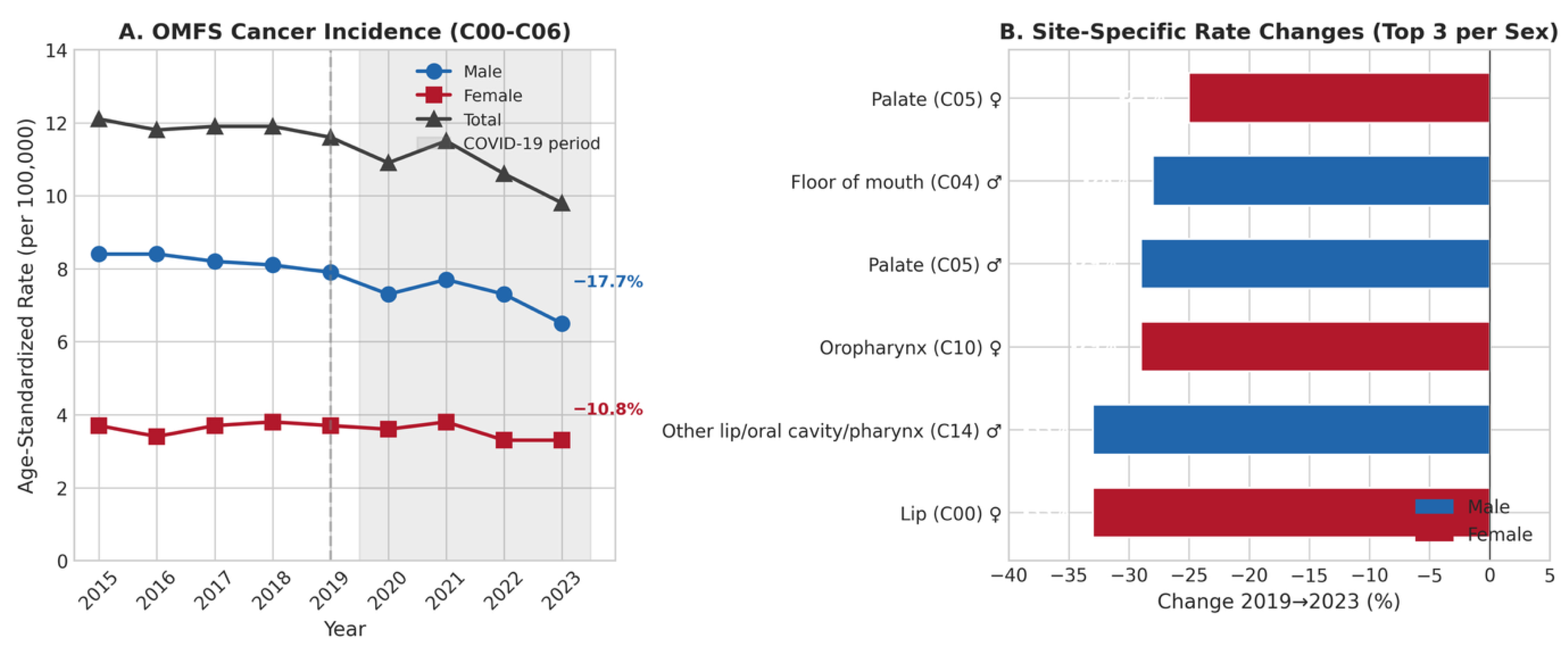 Figure 1. Age-standardized incidence rates of oral cavity cancer in Germany. (A) Temporal trends by sex, 2015–2023. (B) Site-specific rate changes between 2019 and 2023, displaying site-specific rate changes by sex.