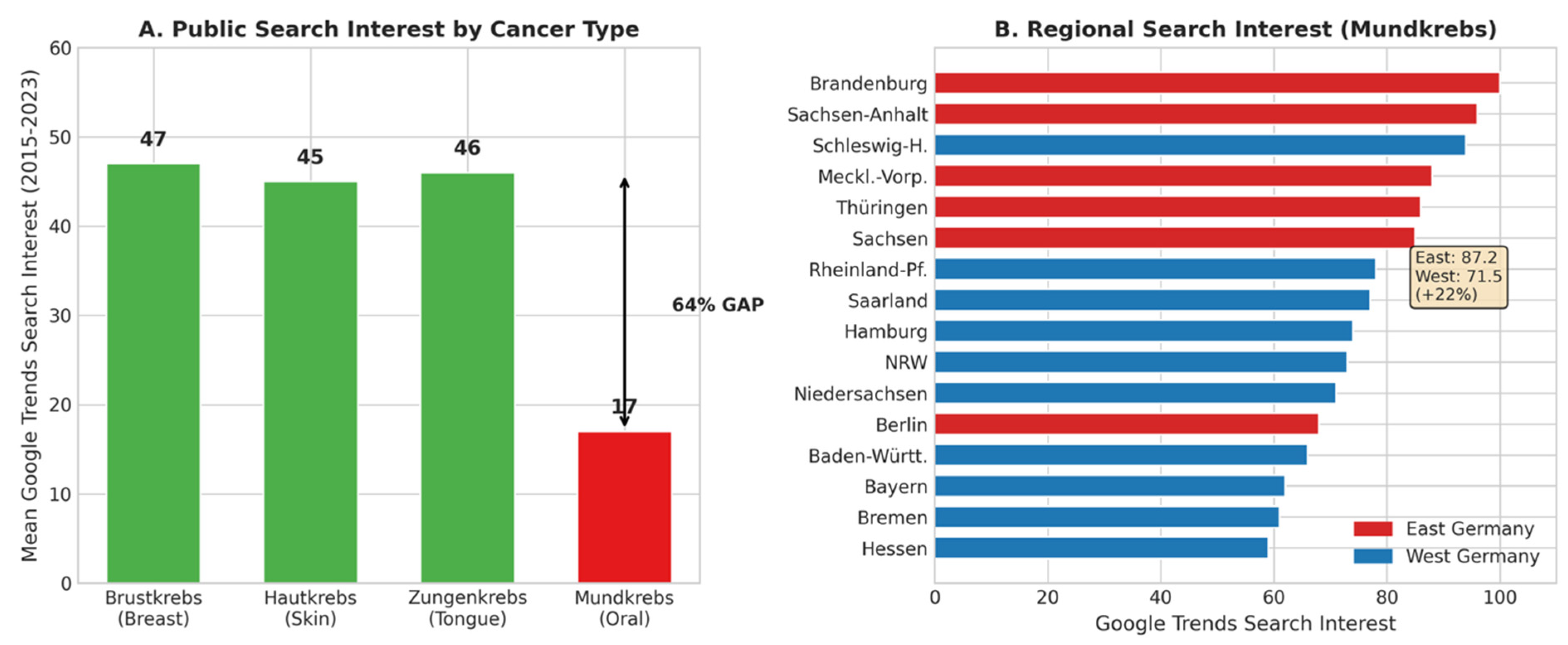 Figure 2. The oral cancer attention gap. (A) Mean Google Trends search interest by cancer type in Germany, 2015–2023. (B) Regional variation in “Mundkrebs” search interest by federal state.