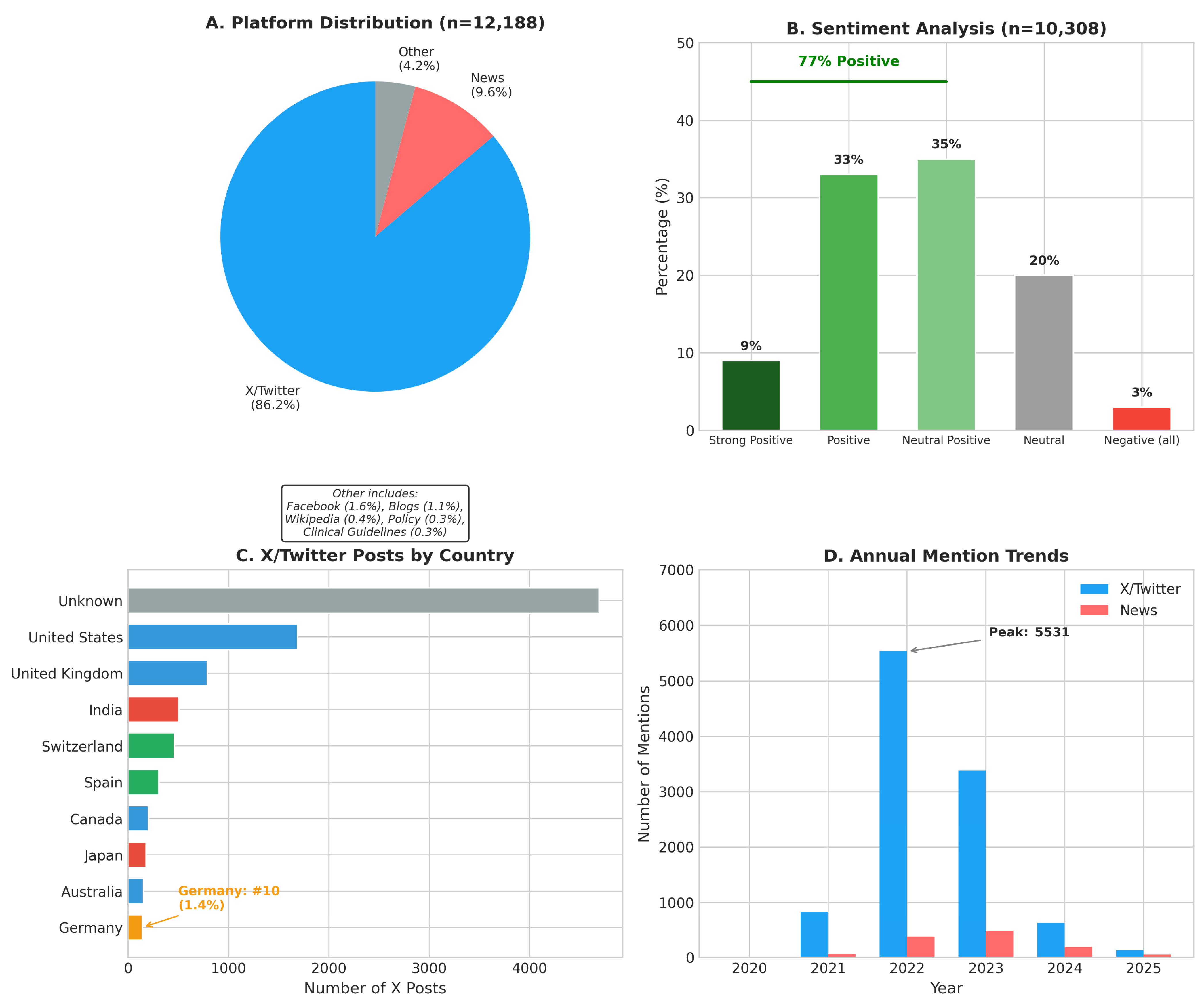 Platform-specific mention counts (X/Twitter, Facebook, news outlets, blogs, Wikipedia, policy documents, and clinical guidelines);