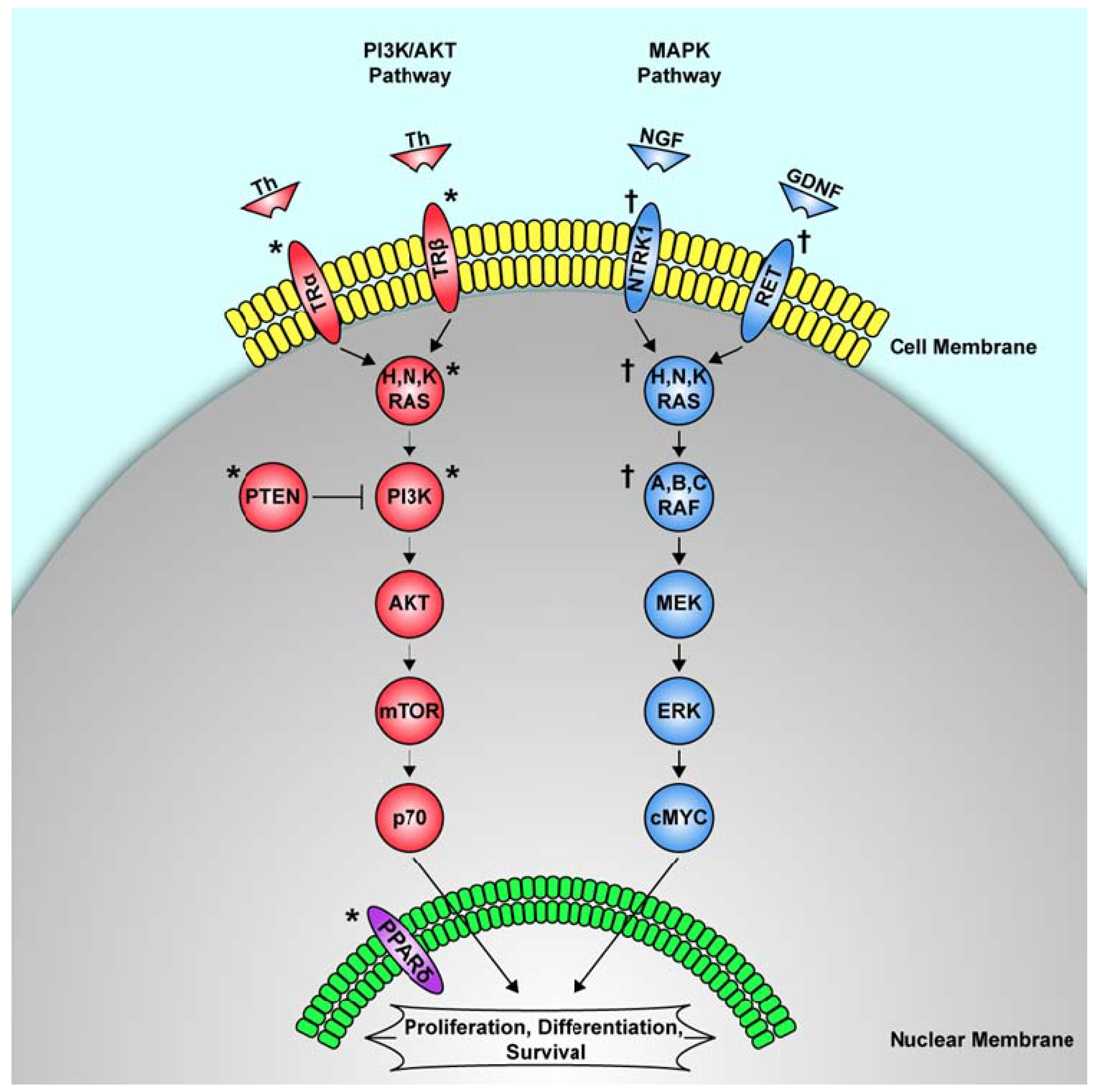 † Denotes known genetic mutations associated with sporadic papillary thyroid cancer. Mutations of the MAPK pathway (in blue) are associated with papillary thyroid cancer. * Denotes known genetic mutations associated with sporadic follicular thyroid cancer. Sporadic mutations of the PI3K/AKT pathway have been associated with follicular thyroid cancer. In the third pathway, mutations of the nuclear receptor PPARgamma have been associated with follicular thyroid cancer. Th = thyroid hormone, TR = thyroid hormone receptor, NGF = nerve growth factor, GDNF = glial cell line-derived neurotrophic factor.