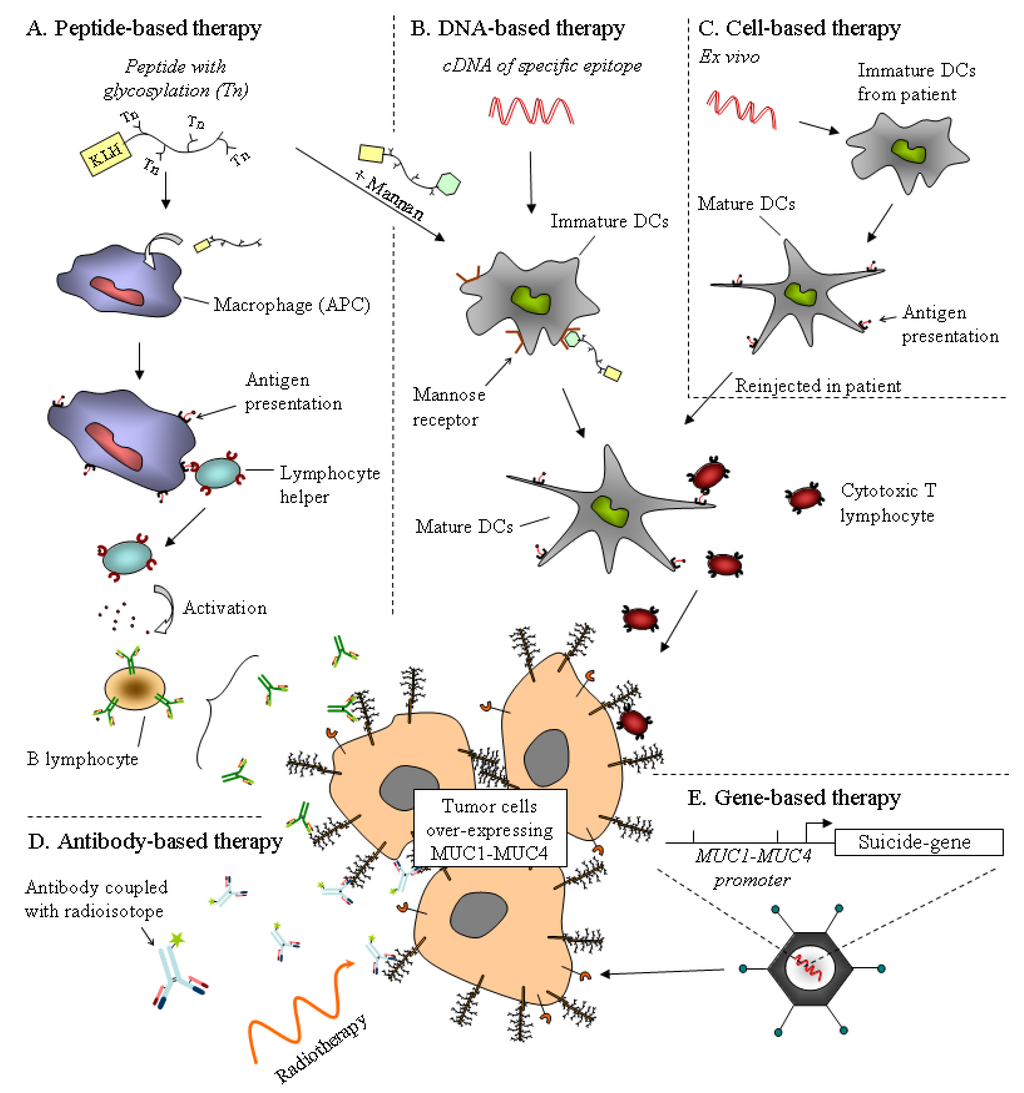 Strategies for mucin-based therapies already used in phase trial. The aim of antigen-based therapy, by the use of a peptide or a cDNA derived from mucin epitopes, is to activate the immune system against tumor cells overexpressing the mucin. (A) The glycosylated mucin peptide, with KLH adjuvant, activates the humoral response by the activation of antigen-presenting cells (APC). The efficiency of this peptide may be increased with a mannan epitope recognized by a mannose receptor on dendritic cells (DCs), which in turn activates the cytotoxic response. (B) DNA vaccine encoding a specific mucin epitope is incorporated by DCs and activates the cytotoxic T lymphocyte. (C) Cell-based therapy is an alternative of DNA vaccine. Immature DCs extracted from the patient are incubated with DNA encoding the mucin epitope. Activated DCs exhibiting mucin antigen are injected into the patient. (D) Antibody-based therapy. Use of antibodies is promising for the detection and treatment of cancer. Antibodies against mucin epitopes are coupled with a radioisotope for radiotherapy ((131)I-PAM4) or a cytotoxic drug to target tumors. (E) Gene-based therapy. Promoter of mucin may be used to deliver a cytotoxic agent on tumor cells.