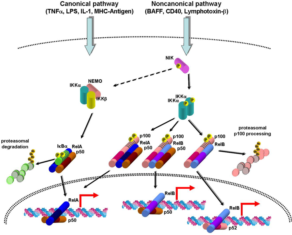 Schematic representation of the main actors intervening in the canonical and noncanonical NF-κB activation pathways. Stimuli such as TNFα, lipopolysaccharide (LPS), interleukin-1 (IL-1), and major histocompatibility complex (MHC)-coupled antigen activate, through intermediary proteins, an IKK complex including the α and β catalytic subunits and the NEMO regulatory subunit. Activation of this complex entails phosphorylation of IκBα thus promoting its subsequent ubiquitination and proteasomal degradation. The nuclear localization signal present in the p50:RelA heterodimer becomes exposed, allowing its translocation to the nucleus and interaction with DNA target elements. The noncanonical pathway is activated by TNF family members such as BAFF, CD40, and lymphotoxin-α1β2 and stabilizes and activates the NIK kinase through inhibition of intermediary proteins including TRAF2 and TRAF3. The NIK kinase has the ability to activate not only the noncanonical IKKα/IKKα complex but also the canonical IKK complex [26]. The IKKα complex phosphorylates p100 on C-terminal serines resulting in proteasomal degradation of p100 bound to p50:RelA and p50:RelB dimers or proteasomal processing of p100 bound to p52. This leads to nuclear translocation of p50:RelA, p50:RelB, and p52:RelB heterodimers, and regulation of their target genes.