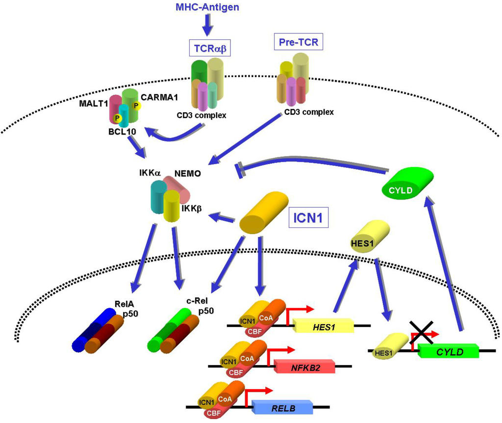 Potential mechanisms of NF-κB activation in T-ALL leukemic cells. TCRαβ and pre-TCR cell surface complexes are known to activate NF-κB in T cells and may do so in T-ALL as well, through constitutive signaling (pre-TCR) or MHC-coupled antigenic stimulation (TCRαβ). Intracellular NOTCH1 protein (ICN1) was shown to interact with and enhance IKK activity in T-ALL cells [67] and to interact with and stabilize p50:c-Rel heterodimers in the nucleus of activated splenocytes [89]. The ICN1-induced HES1 repressor facilitates NF-κB activation by repressing the expression of the deubiquitinating enzyme CYLD [71], a negative regulator of the canonical NF-κB pathway. Together with CBF and co-activators (CoA), ICN1 may potentially facilitate noncanonical NF-κB activation by direct induction of the NFKB2 and RELB genes [67,88].