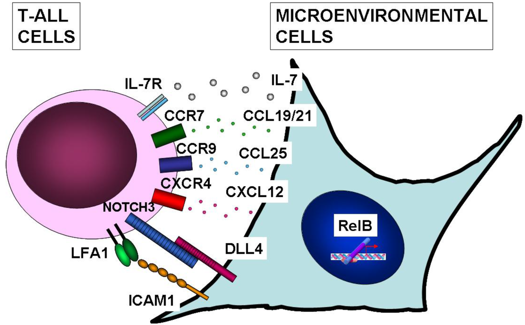 Microenvironmental signals assisting T-ALL leukemic cells. IL-7 produced by stromal cells was shown to induce survival and proliferation of T-ALL cells [114,115]. T-ALL cells were shown to express cognate receptors and to respond to CCL19/CCL21, CCL25 and CXCL12 chemokines, which are potentially induced by RelB [18]. CCR7 stimulation by CCL19 or CCL21 was shown to direct T-ALL cells to the mouse central nervous system [113]. CCR9 stimulation by CCL25 induced T-ALL chemotaxis and resistance to chemotherapy-induced apoptosis [127], while CXCR4 stimulation by CXCL12 also induced T-ALL chemotaxis [128]. Another study showed that the NOTCH3 ligand, Dll4, mediated T-ALL escape from tumor dormancy in mice [116]. Stromal cells expressing the ICAM1 adhesion molecule were shown to favor in vitro survival of T-ALL cells expressing LFA-1 integrin [129]. Whether the expression and/or function of these or other stromally produced proteins is controlled by RelB or other NF-κB subunits remains to be determined.