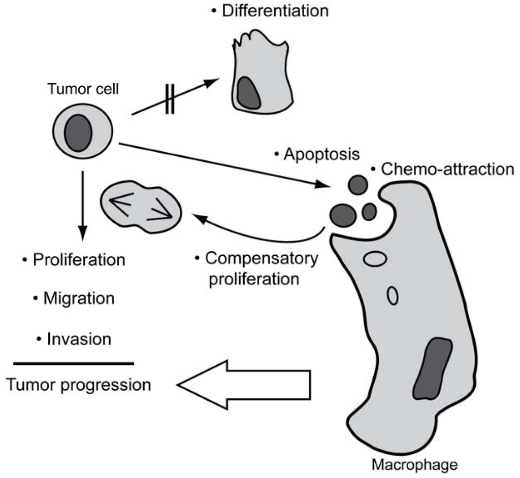 These findings point towards a possible role of apoptosis in promoting tumor progression which can be envisaged in at least two ways: first, by stimulating macrophage infiltration; second, by increasing the number of cell divisions. Apoptotic cells are known to attract macrophages [154]. In normal tissues this provides for the rapid clearance of apoptotic bodies. In a transgenic breast cancer model, infiltrating macrophages have been shown to promote angiogenesis and progression of tumors [155]. From human cancer, a correlation between tumor-associated macrophages and progression is well known [156]. In cancer apoptotic cells may thus constitute a source of chemo-attractants stimulating macrophage infiltration and tumor progression.