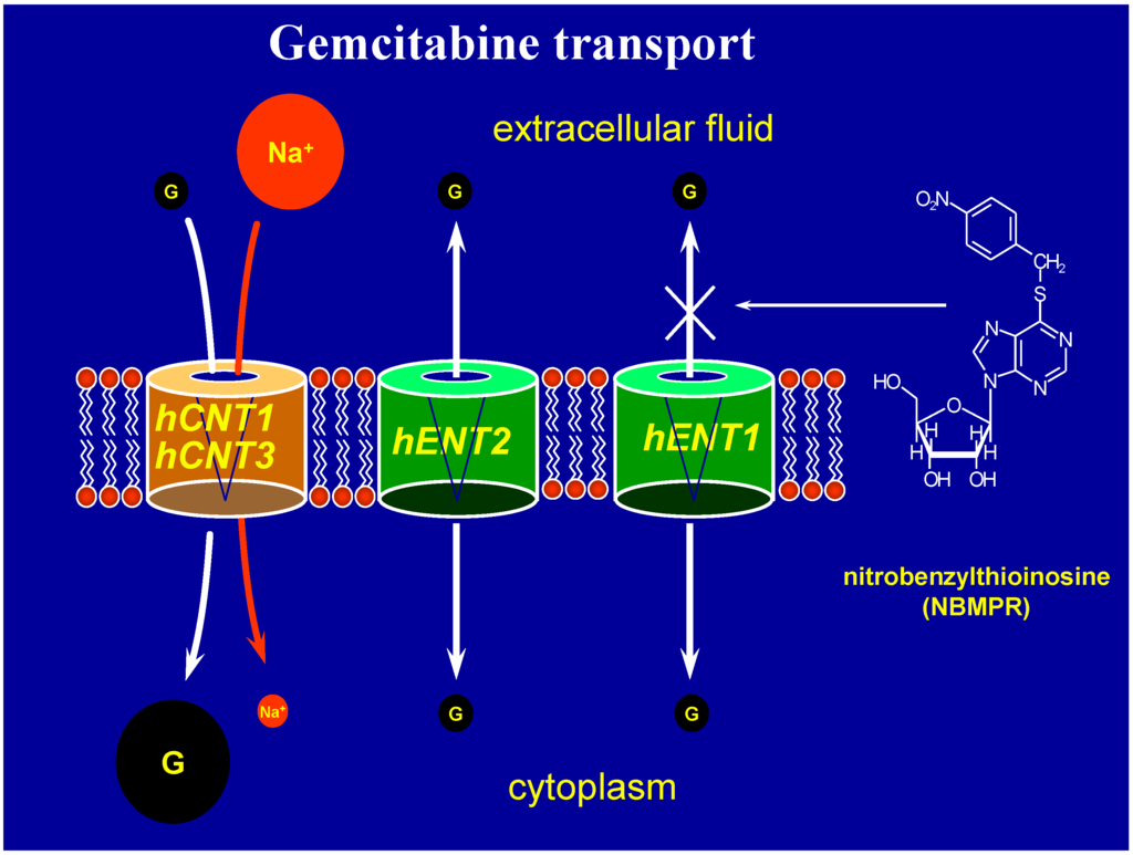 Gemcitabine cellular uptake is primarily mediated by hENT1, which can be identified at varying levels in all human tissues. While the other transporters (hENT2, hCNT1, and hCNT3) mediate gemcitabine uptake in laboratory conditions [21,22,23,24,25], their contributions to total cellular gemcitabine uptake remain relatively minor, and can only be readily detected when NBMPR is used to inhibit hENT1 activity. Furthermore, in vitro data demonstrate cytotoxic nucleoside resistance with hENT1 deficiency [24,26,27,28,29]. Given the short infusion times of gemcitabine (30 minutes) and the short serum half-life of gemcitabine, due to its rapid metabolism and excretion as non-toxic metabolites, it follows that cells with low hENT1 protein abundance might be clinically resistant to gemcitabine.