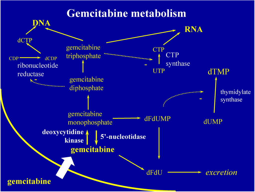 Once within the cell, nucleotide kinases phosphorylate gemcitabine to gemcitabine monophophate and then sequentially to its active metabolites, gemcitabine diphosphate and gemcitabine triphosphate. The first phosphorylation step by deoxycytidine kinase is the rate limiting step (Figure 2). Once in triphosphate form, gemcitabine is incorporated into cellular DNA and protected from repair by base pair excision with the addition of another natural nucleotide [30,31]. Gemcitabine is self-potentiating and in addition to its masked chain termination of DNA, gemcitabine has other mechanisms of cancer control which include induction of apoptosis by gemcitabine monophosphate, blocking de novo DNA synthesis by gemcitabine diphosphate, and lowering the pool of opposing deoxycytidine triphosphate by gemcitabine triphosphate [30,32,33].