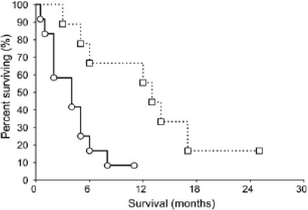 Kaplan-Meier estimate of survival in gemcitabine-treated pancreatic cancer patients. Patients for whom all adenocarcinoma cells had detectable hENT1 (□ and dashed line) had significantly longer survival than those patients with heterogeneous areas of adenocarcinoma cells lacking hENT1 (○ and continuous line; median survival 13 versus four months; P = 0.01). Reproduced with permission from [34].