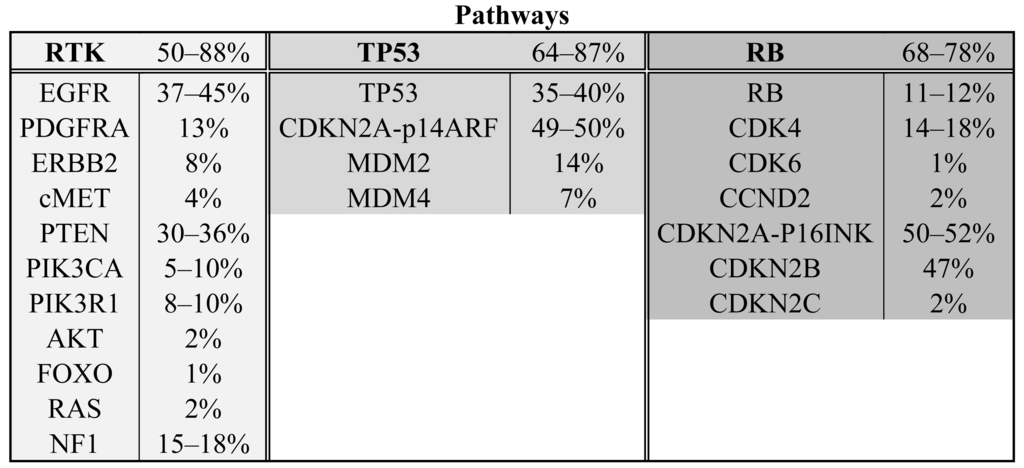 TP53 signaling is important in apoptosis, cellular senescence and cell cycle arrest in response to DNA damage. Most tumor types need to circumvent or shut down the TP53 pathway. TP53 heterozygous dominant negative point mutations and homozygous deletions are common in GBM (35–40%) [6,7]. Two TP53 inhibitors, MDM2 and MDM4, that are involved in the ubiquitinylation and degradation of TP53, are amplified in 14% and 7% of the glioblastomas, respectively [6]. The CDKN2A locus is also part of the TP53 pathway and is frequently deleted or inactivated in glioblastomas (49–50%) [6,7]. One of the two genes that can be expressed from the CDKN2A locus is P14ARF, which is an inhibitor of MDM2. The CDKN2A locus also encodes for p16INK4A which is part of the pRB signaling pathway (see below)