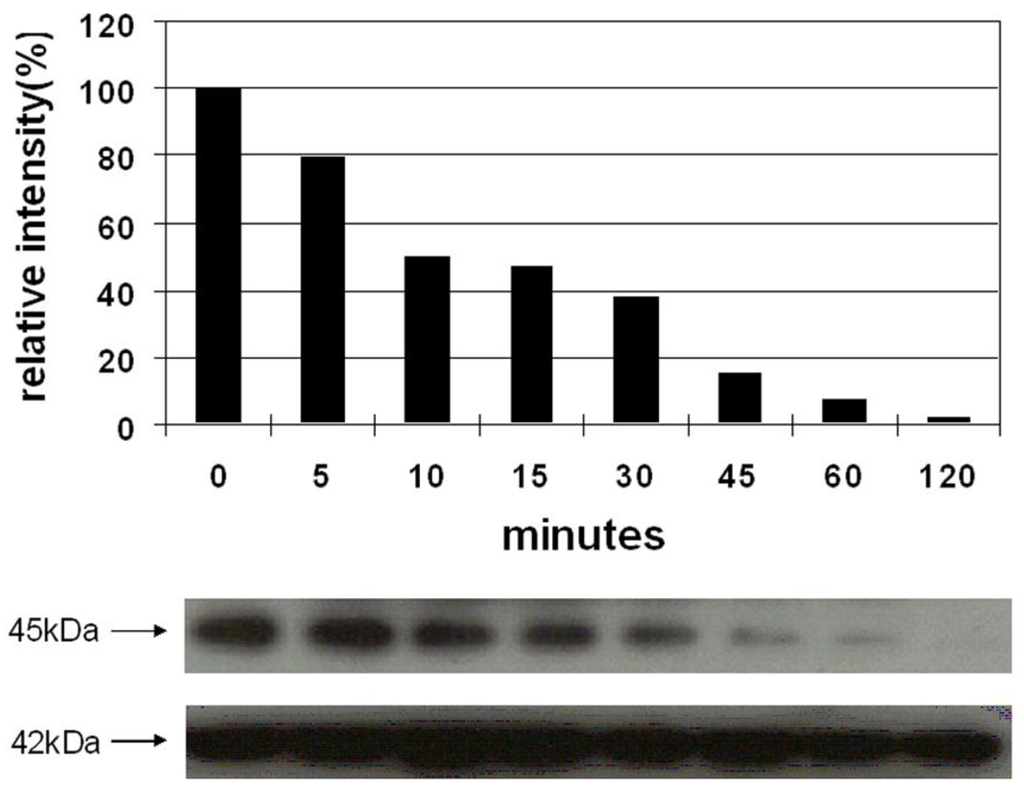 The prototype member of the MEK kinase family, designated MAP kinase kinase (MKK-1)/or MEK-1, specifically phosphorylates the MAP kinase regulatory threonine and tyrosine residues present in the Thr-Glu-Tyr motif of ERK 1/2 [43,44]. A second MEK family member, i.e., MEK-2, resembles MEK-1 in terms of its substrate specificity but is seven residues longer than MEK-1 with the amino acid sequence of MEK-2 being 81% identical to MEK-1 [43].