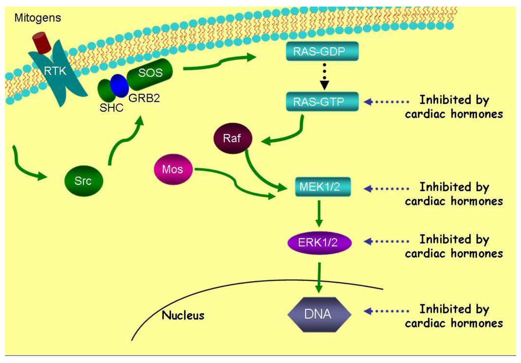 The heart is a sophisticated endocrine gland synthesizing the atrial natriuretic peptide prohormone which contains four peptide hormones, i.e., atrial natriuretic peptide, vessel dilator, kaliuretic peptide and long-acting natriuretic peptide, which decrease up to 97% of human pancreatic, breast, colon, prostate, kidney and ovarian carcinomas as well as small-cell and squamous cell lung cancer cells in cell culture. In vivo, these four cardiac hormones eliminate up to 80% of human pancreatic adenocarcinomas, two-thirds of human breast cancers, and up to 86% of human small-cell lung cancers growing in athymic mice. Their signaling in cancer cells includes inhibition of up to 95% of the basal activity of Ras, 98% inhibition of the phosphorylation of the MEK 1/2 kinases and 97% inhibition of the activation of basal activity of the ERK 1/2 kinases mediated via the intracellular messenger cyclic GMP. They also completely block the activity of mitogens such as epidermal growth factor's ability to stimulate ERK and Ras. They do not inhibit the activity of ERK in healthy cells such as human fibroblasts. The final step in their anticancer mechanism of action is that they enter the nucleus as demonstrated by immunocytochemical studies to inhibit DNA synthesis within cancer cells.1. Introduction