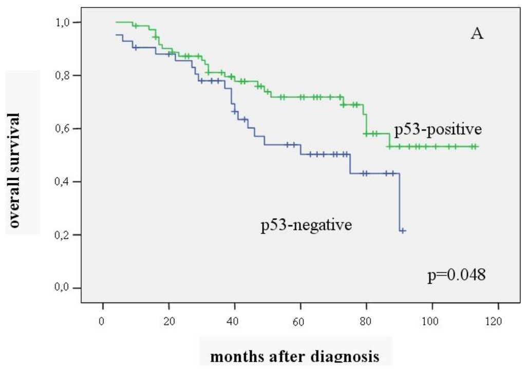 Univariate Kaplan-Meier analysis showed that overall survival was significantly better in patients with p53-positive carcinomas than in those without p53 expression (mean value 83.4 ± 4.9 vs. 60.00 ± 5.1 months) (p = 0.048). Recurrence-free survival did not differ between the two groups (mean value 80.9 ± 5.4 vs. 59.0 ± 5.5 months) (p = 0.161) (Figure 1A, 1B).