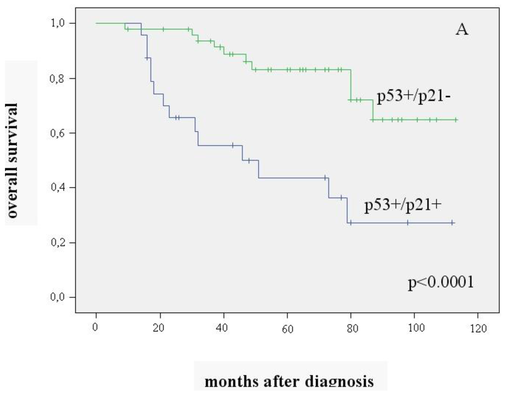 Positive p53 expression was found in 72 of the 114 patients (63%), which coincides with findings reported by others [12,14]. This subgroup was analyzed separately with regard to p21 expression. To our knowledge, this is the first study to demonstrate that significantly better overall and recurrence-free survival is associated with p53+/p21− than with p53+/p21+ carcinomas.