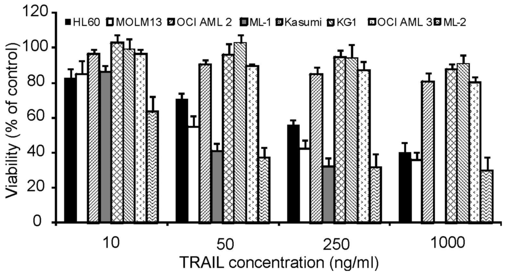 The cell lines exhibited variable sensitivities to rhTRAIL. Kasumi, KG-1, OCI AML2 and OCI AML3 were highly resistant showing a cell viability of >80% at the highest rhTRAIL concentration, while HL-60, ML-1, ML-2 and MOLM13 cells were more susceptible to the cytotoxic effects of rhTRAIL in a dose dependent manner (Figure 1).