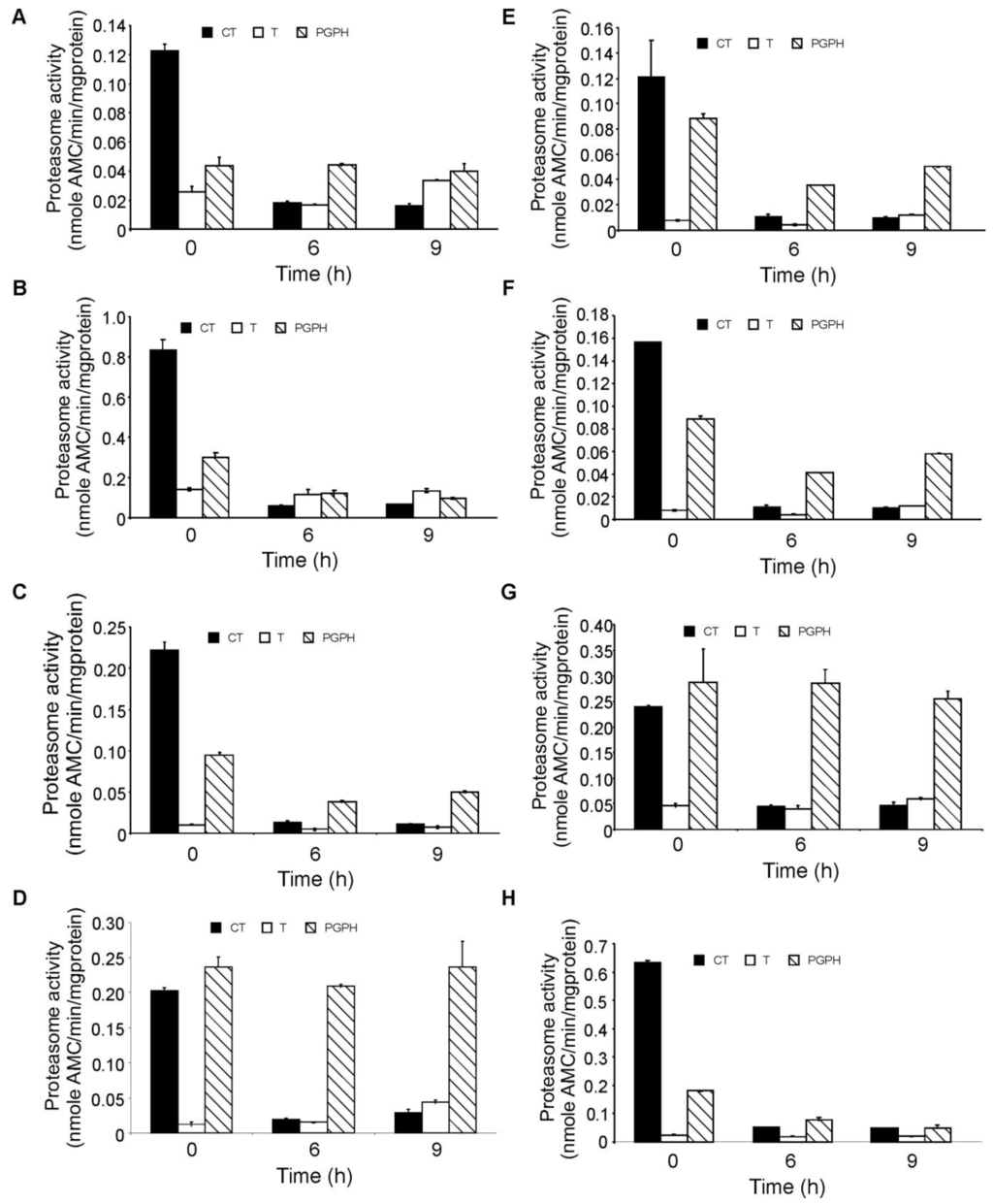 The chymotryptic, tryptic and PGPH (peptidylglutamyl peptide hydrolyzing) activities of the proteasome were measured by using specific, fluorescently tagged peptide substrates (N-Succinyl-LLVY-AMC, Z-ARR-AMC and Z-LLE-AMC (all from Merck), respectively). Following treatment, cells were lysed in 50 μL of lysis buffer (13 mM Tris buffer containing 5 mM MgCl2, pH 7.8) through two freeze-thaw cycles. The samples were divided into 2 × 25 μL and a 175 mL of substrate buffer added (5 mM ATP, 0.5 mM DTT, 5 mM EDTA and 50 μM proteasomal substrate in lysis buffer). Activity was measured as a rate of cleavage of fluorogenic substrates and was determined by monitoring the fluorescence of released AMC (Amido 4-Methylcoumarin), using a fluorescent plate reader (Wallac/Victor 3, PerkinElmer) at an excitation wavelength of 395 ± 25 nm and emission wavelength of 460 ± 40 nm. The assay was run over a period of 35 min (30 cycles, 1 measurement per min) at 37 °C and results were expressed in nmol AMC released/min/mg protein. The protein concentration of the lysates was determined by BCA protein assay (Pierce) according to the manufacturer's instructions.