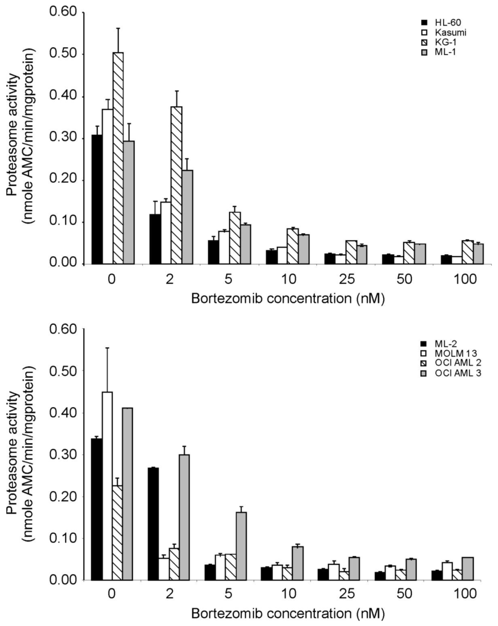 In order to investigate the degree of inhibition of the proteasome following bortezomib treatment, the three different enzymatic activities of the proteasome, chymotrypsin-like, trypsin-like and peptidyl-glutamyl-peptidyl hydrolase (PGPH)), were measured in the panel of AML cell lines after 6 and 9 h of exposure. Using a concentration of 100 nM (previously shown to induce almost complete cell death in all cell lines) bortezomib almost completely inhibited the chymotryptic activity of the proteasome in all cell lines cells after 6 h of treatment (Figure 3). Tryptic activity was the lowest of the three enzymatic activities and remained unaffected by bortezomib treatment in all cell lines while the PGPH activity was partially inhibited apart from in HL-60, ML-2 and OCI AML2 cells in which PGPH activity was unaffected by bortezomib, however these cell lines did not show higher or lower sensitivity to bortezomib.