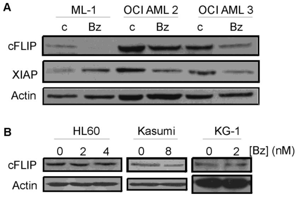 Since bortezomib can potentially inhibit NF-κB activation, we analyzed the effect of bortezomib on the relative expression of the anti-apoptotic proteins, c-FLIP and XIAP in ML-1, OCI AML2 and OCI AML3 cells. The expression of c-FLIP was downregulated after bortezomib treatment (Figure 6A) in all three cell lines. XIAP was also downregulated post treatment with bortezomib with the exception of ML-1 cells which exhibited an increased expression, an effect which may be mediated by inhibition of XIAP degradation via the proteasome. In addition, we analyzed the effect of bortezomib on the expression of c-FLIP in HL-60, Kasumi and KG-1 cells. On the contrary, bortezomib did not reduce the expression of c-FLIP in HL-60, Kasumi and KG-1 cells, cell lines which bortezomib could not sensitize for TRAIL-induced apoptosis (Figure 6B).