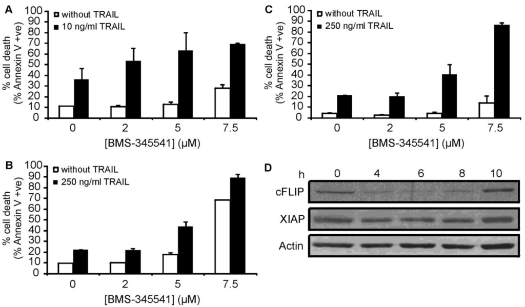 As both c-FLIP and XIAP are known to be regulated by the NF-κB pathway, our data supports the theory that inhibition of NF-κB activation plays a central role in the sensitization of these particular AML types to TRAIL-induced apoptosis. To further investigate the role of NF-κB in bortezomib-mediated sensitisation, ML-1, OCI AML2 and OCI AML3 cells were pre-treated with the inhibitor-κB kinase (IKK) inhibitor BMS-345541 [37] for 15 h followed by a 24 h treatment with rhTRAIL. BMS-345541 could sensitize all three cell lines to rhTRAIL-induced apoptosis (Figure 7A-C), which was associated with the downregulation of c-FLIP and XIAP expression in OCI AML2 cells (Figure 7D) lending further support to the importance of NF-κB inhibition in bortezomib-induced sensitization to TRAIL.