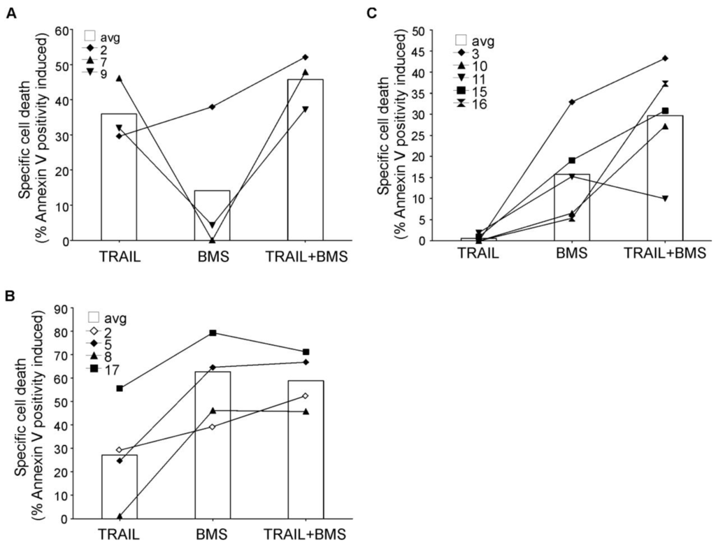 BM MNCs were isolated by density gradient centrifugation and cryopreserved in 10% dimethyl sulfoxide (DMSO) freezing medium. Following a rapid thawing and centrifugation to remove DMSO of the freezing medium, cells were cultured in RPMI/10% fetal bovine serum. Cell viability was assessed at the time of thawing the cells and experiments were only carried out in samples that showed at least 75% viability. In addition, samples that showed high rate of spontaneous death and the percentage of live cells reduced to 25% or less at time of harvesting were also excluded from further analysis. The cells were treated with 250 ng/mL of WT rhTRAIL alone for 24 h or in combination with 5 μM BMS-345541 added simultaneously.