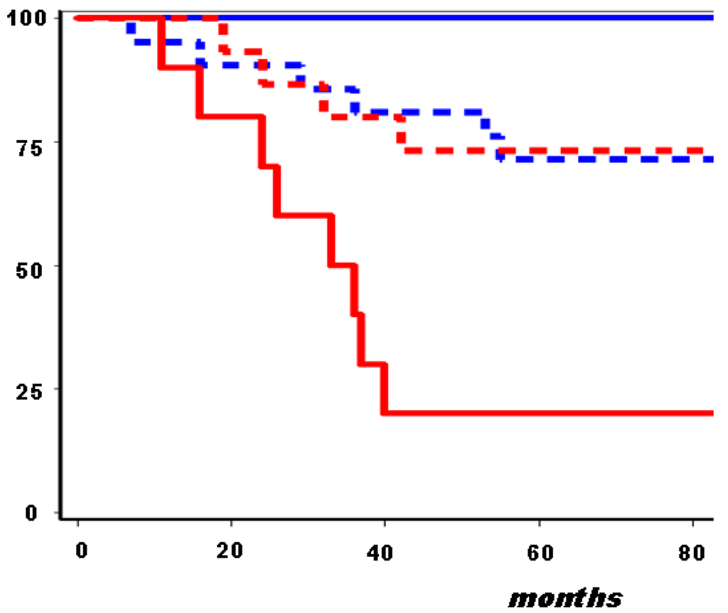 Similar findings were also validated from the analysis of public data bases (node-negative breast cancers from the Netherlands Cancer Institute [51]), which confirmed the prognostic value of an altered expression in self-renewal pathways, including hedgehog (Gli3 e PTCH1), Wnt (FZD6), and Notch (Jag2). Moreover, in our case series of ER-positive breast carcinomas, the combined consideration of GATA3, ALDH1 and PTCH1 allowed the identification of two subsets of patients at minimal risk (18 cases disease free 7 years after the diagnosis) or at a very high risk of relapse (16 out of 20 cases with new disease manifestations, mainly in distant sites) (Figure 1).