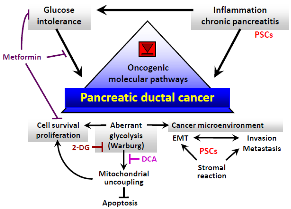 Although systemic metabolic disorders such as obesity and type II diabetes mellitus (DM) influence the risk of developing pancreatic cancer and clinical outcomes (reviewed in [9,10]), the abnormal metabolic profile of cancer cells dictates their survival, proliferation, and invasion, as well as susceptibility to chemotherapy and radiation [11,12]. Thus, metabolic disorder and altered tumor cell metabolism are potential targets for cancer treatment and (chemo) prevention [13,14].