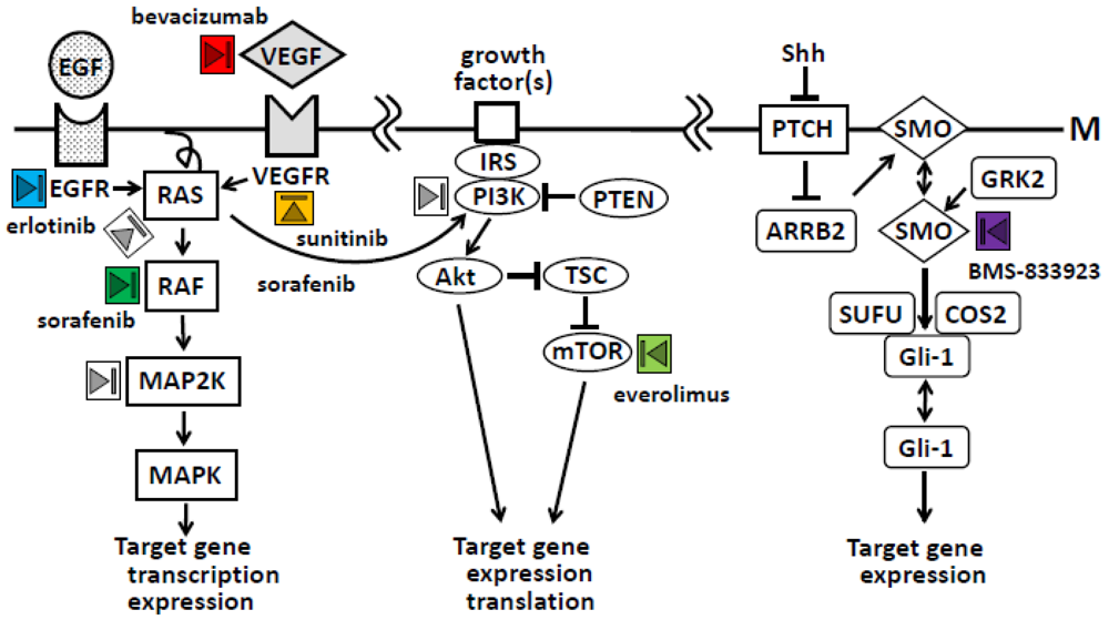 Molecular studies have investigated the complex genetic mechanisms of cancer, which involve multidirectional signal transduction pathways [3,59,60]. As shown in Figure 2, the major signal transduction pathways in pancreatic cancer pathogenesis and progression are RAS/mitogen-activated protein kinase (MAPK), phosphatidylinositol 3-kinase (PI3K)/Akt/mTOR, and hedgehog pathways [3]. The receptor tyrosine kinase family and their ligands, which include epidermal growth factor (EGF) receptor (EGFR), vascular endothelial growth factor (VEGF) receptor (VEGFR), and PDGF receptor (PDGFR), are targets of therapy because they are overexpressed in many tumor types, including pancreatic cancer [61].