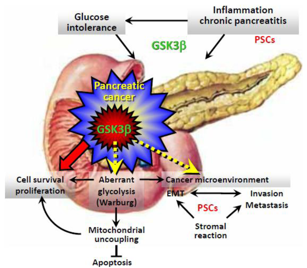 Pancreatic cancer develops and progresses through complex, cumulative biological processes involving metabolic disorder, local inflammation, and deregulated molecular pathways. The resulting tumor aggressiveness hampers surgical intervention and renders pancreatic cancer resistant to standard chemotherapy and radiation therapy. Based on these pathologic properties, several therapeutic strategies are being developed to reverse refractory pancreatic cancer. Here, we outline molecular targeting therapies, which are primarily directed against growth factor receptor-type tyrosine kinases deregulated in tumors, but have failed to improve the survival of pancreatic cancer patients. Glycogen synthase kinase-3β (GSK3β) is a member of a serine/threonine protein kinase family that plays a critical role in various cellular pathways. GSK3β has also emerged as a mediator of pathological states, including glucose intolerance, inflammation, and various cancers (e.g., pancreatic cancer). We review recent studies that demonstrate the anti-tumor effects of GSK3β inhibition alone or in combination with chemotherapy and radiation. GSK3β inhibition may exert indirect anti-tumor actions in pancreatic cancer by modulating metabolic disorder and inflammation.1. Introduction