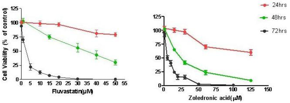 Treatment of T24 cells with increasing concentrations of fluvastatin (0.1 to 100 μM) or zoledronic acid (0.1 to 100 μM) for 24–72 hours caused dose and time-dependent cell growth inhibition. T24 cells were slightly more sensitive to fluvastatin (IC50 2.67 ± 0.61 μM at 72 h) than to zoledronic acid (IC50 5.35 ± 1.35 μM at 72 h) (Figure 1).