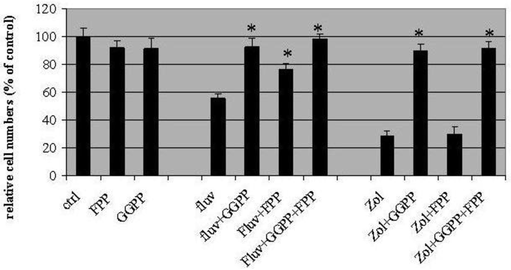 In these experiments, fluvastatin (3μM) and zoledronic acid (10μM) inhibited cell proliferation by 44 ± 6.2%, and 71 ± 2%, respectively (Figure 2). Geranylgeranyl pyrophosphate (GGPP, 10 μM) appeared to completely block T24 growth inhibition induced by the two drugs, with the proportion of surviving cells similar to control values (91 ± 8% for fluvastatin and 89 ± 6% for zoledronic acid). On the other hand, farneysl pyrophosphate (FPP) could only partially rescue the growth inhibition induced by fluvastatin (76.3 ± 4% of control) while leaving cytotoxicity of zoledronic acid unaffected (30 ± 5% of control). Growth inhibition by both fluvastatin and zoledronic acid could be rescued completely by adding GGPP and FPP in combination (98 ± 4% control for fluvastatin and 91 ± 5% control for zoledronic acid).