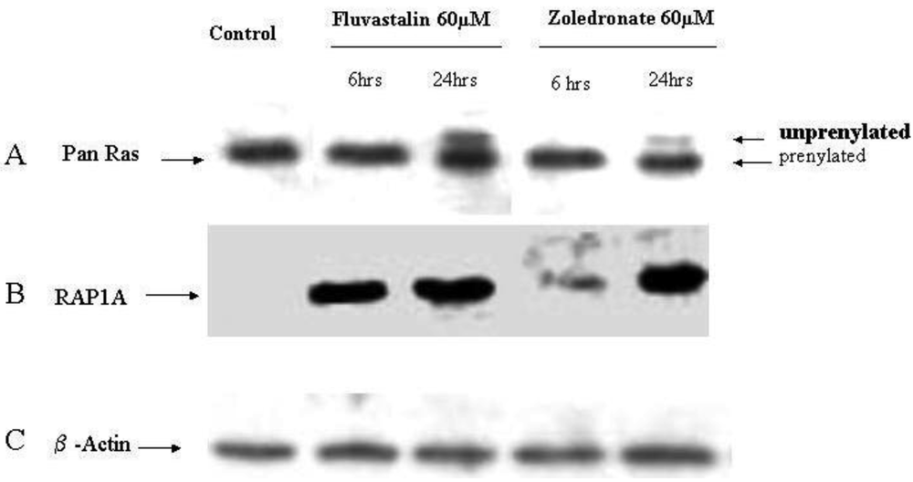 In order to investigate the molecular mechanisms of fluvastatin and zoledronic acid induced cell growth inhibition, the effects of these two drugs on protein prenylation of Ras and Rap1 were analyzed by Western blot. Results show that both drugs inhibit Ras farnesylation after 24 hours treatment but not six hours (Figure 3). Fluvastatin inhibits Rap geranygeranylation at both six and 24 hours treatment, while zoledronic acid show greater inhibition at 24 hours treatment and less inhibition at six hours (Figure 3).