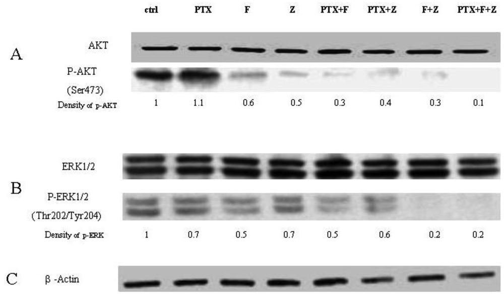 Cells were allowed to reach 70% confluence in RPMI containing 10% of FCS for 24 hours, before drugs were added in serum-free medium for another 24 hours. Cells were then washed with cold PBS buffer and lysed in buffer containing 50 mM Tris-HCI (pH7.5), 150 mM NaCI (150 mM), EGTA (1 mM), EDTA (2 mM), 2.5%(V/V) glycerol, NaF (10 mM), 0.2%(V/V) Triton X-100, 0.3% (V/V) NP40, aprotinin (5 μg/mL), Leupeptin (10 μg/mL), pepstatin (10 μg/mL), activated NaVO3 (2 mM) and PMSF (1 mM). Lysates were sonicated in an ice water bath for 20 seconds; the supernatant containing protein was separated from the insoluble material by centrifugation at 10,000rpm for 10 minutes at 4 °C. The total protein in each sample was then quantified using Bicinchoninic Acid Kit (Sigma) by following the protocol described. Samples containing equal amounts of protein were mixed with loading buffer and boiled for 5 minutes. Proteins were then separated by SDS-PAGE, and the proteins on the gels were transferred to PVDF-Membrane (Amersham Biosciences) and incubated with different antibodies. After incubation with HRP-conjugated secondary antibodies, the primary antibody binding was visualized with Western Lightning™ Chemiluminescence (PerkinElmer LAS, Inc.). Density of the bands were quantified by scanning with Gel Doc 200 (Bio-Rad) and normalized by β-actin as loading control (density of the sample /density of β-actin); P-AKT and P-ERK expression levels were further normalized by density of the band of the non-drug treated control. All Western blots were repeated at least once, and similar results were confirmed.