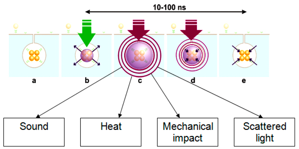 The generation of a PNB (which is not a particle but a transient event) occurs through the optical excitation of plasmonic NPs with short laser pulses that causes NP heating and the consequent evaporation of the environment around the NP surface (Figure 1). The mechanism of generation of a plasmonic nanobubble includes several stages (Figure 1):