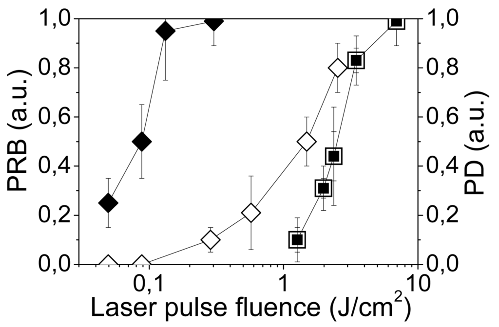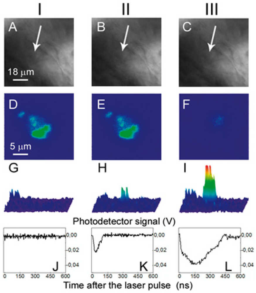 We simultaneously measured the lifetime of the PNB in each irradiated cell as a function of the laser pulse fluence. The lifetime of the non-invasive PNBs was found to be about 5-times shorter than that of the damaging ones (Table 3). This implies a similar difference in the maximal diameters of non-invasive and damaging PNBs. We consider that the maximal diameter of a PNB plays a major role in cell damage: small PNBs do not damage the cell, while an increase in PNB size by several times induces almost immediate disruption of the cellular membrane and skeleton as was revealed with electron scanning microscopy.