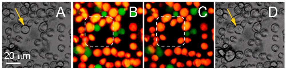 We evaluated the selectivity of the PNB-induced damage of cancer cells when surrounded by non-cancer stromal cells expected to be in the typical cancer microenvironment. We fluorescently labeled stromal (HS-5) and prostate cancer cells (C4-2B) with calcein vital dyes of green (cancer) and orange (stromal) colors and mixed them in the proportion of HS-5:C4-2B as 5:1. We treated the mixture of the cells with two gold conjugates using PSMA (prostate cancer specific) and C225 (anti-epidermal growth factor receptor) antibodies. Large PNBs were generated only in cancer cells. PNBs were also observed on occasion in stromal cells, but the probability was below 20% and their size was small compared to the size of cancer cell-generated PNBs. Within the area irradiated with laser pulses (shown within a dashed line in Figure 11) we discovered that only the cancer cell was damaged [61]. The vital dye stays in the cell with an intact membrane and quickly leaks out of the cell with a compromised membrane [112]. The damage to the cancer cell in the center (observed as the loss of green fluorescence) was in line with the increased size (lifetime) of the PNBs generated specifically in C4-2B cells (see Figure 11), and with the mechanical nature of cell damage that is associated with the disruption of the cellular structures including the plasma membrane [58,85,96,113]. This experiment clearly demonstrated the selectivity of PNBs.