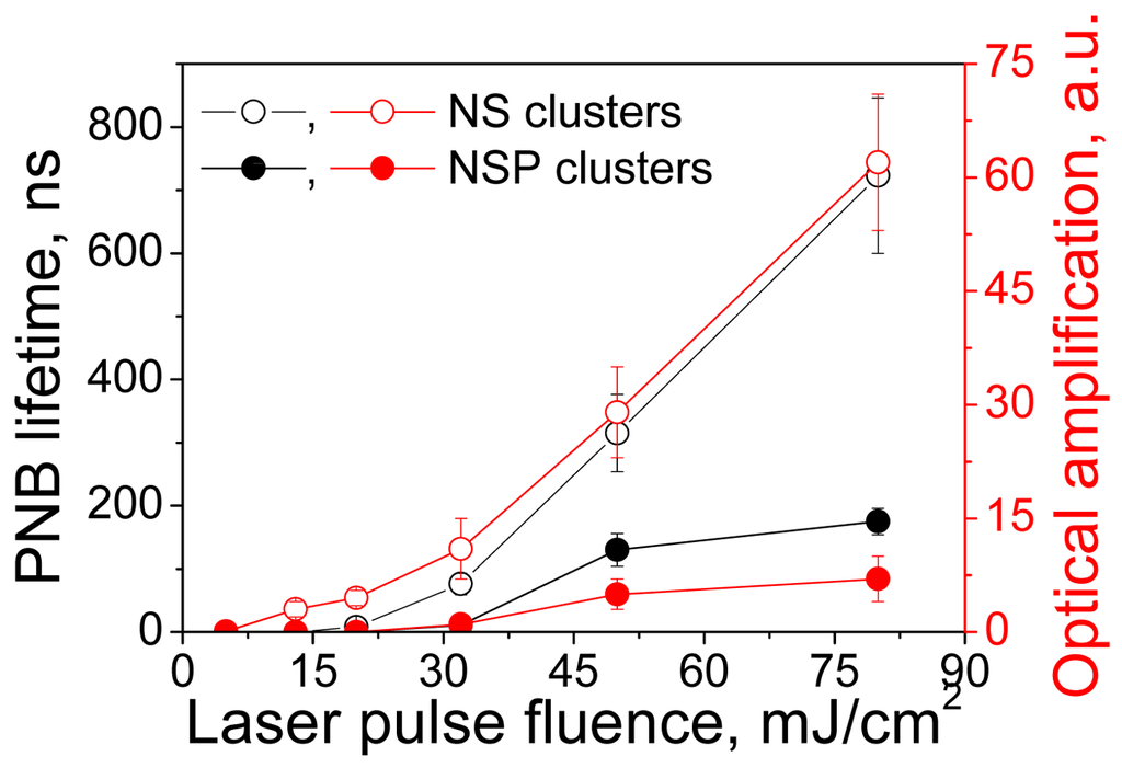 The generation of a PNB has a threshold nature, a PNB cannot emerge around an NP if the excitation fluence is below a specific level. The NP cluster-threshold mechanism makes the generation of PNBs very selective, as can be seen from Figure 12. The PNB generation threshold fluence was found to be determined by nanoparticle size, heat capacity, aggregation state, and the pump laser pulse duration [55-57,99,116-118]. Low PNB generation threshold fluence can be achieved with NPs with a high ratio of surface to heat capacity (such as in nanoshells), through NP clusterization and through the shortening of the laser pulse to a level below the characteristic time for thermal relaxation of the NPs or their cluster. The generation of a PNB does not coincide with the formation of vapor around the surface of a transiently heated plasmonic NP, and requires additional energy that significantly exceeds the explosive boiling threshold. This additional and higher threshold also results in the limitation of the minimal lifetime (and hence maximal diameter) of PNBs at the level of 9 ns [57]. A possible explanation for the discovered mechanism of PNB generation relates to the effect of surface tension pressure that is applied to the vapor nucleus near the NP surface. Due to the small size of NPs, the surface tension pressure around the NP (and around the vapor nucleus forming around the NP) may be very high, thus preventing PNB expansion (as can be expected for macro-bubbles). As a result, additional optical energy is required to generate a PNB.